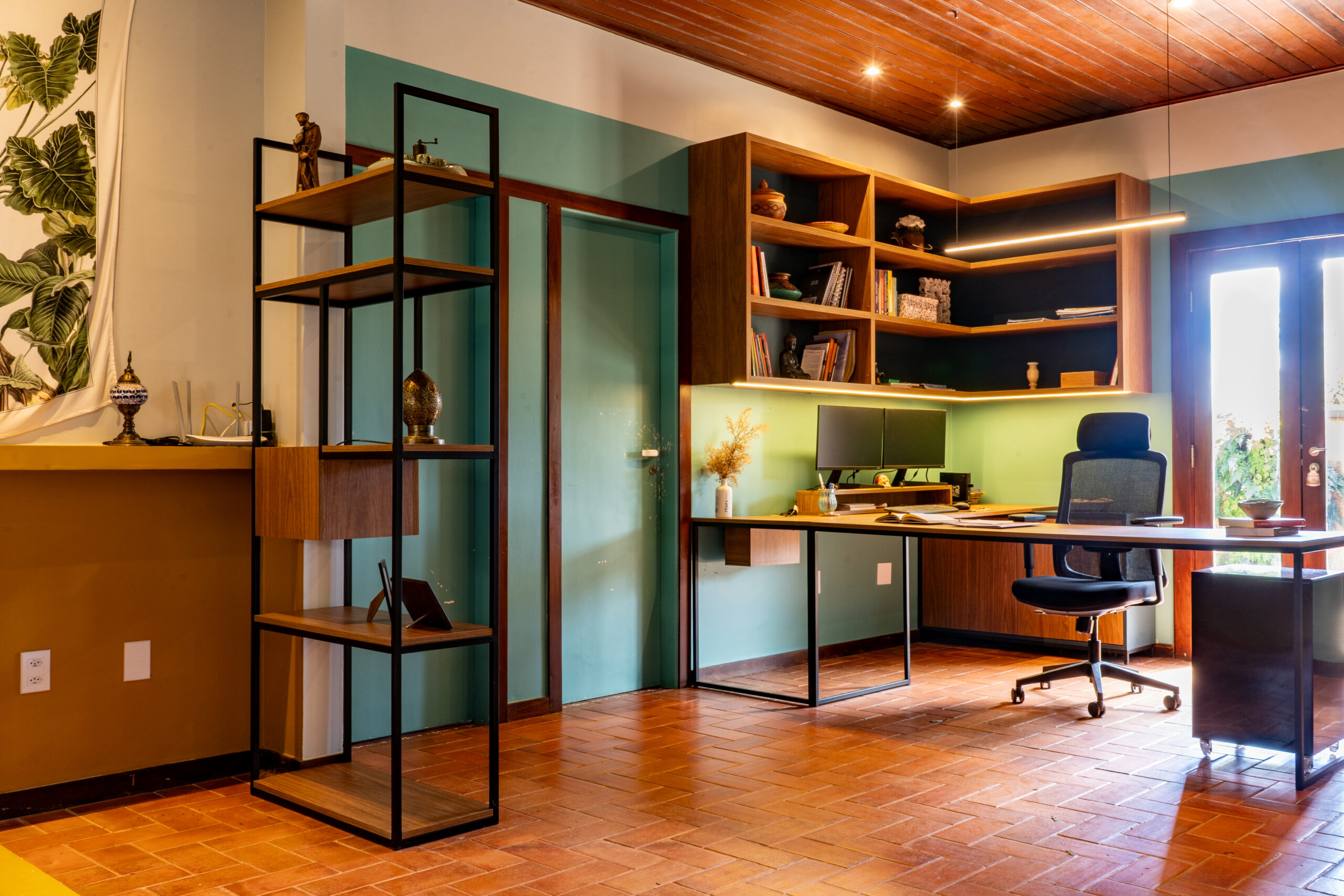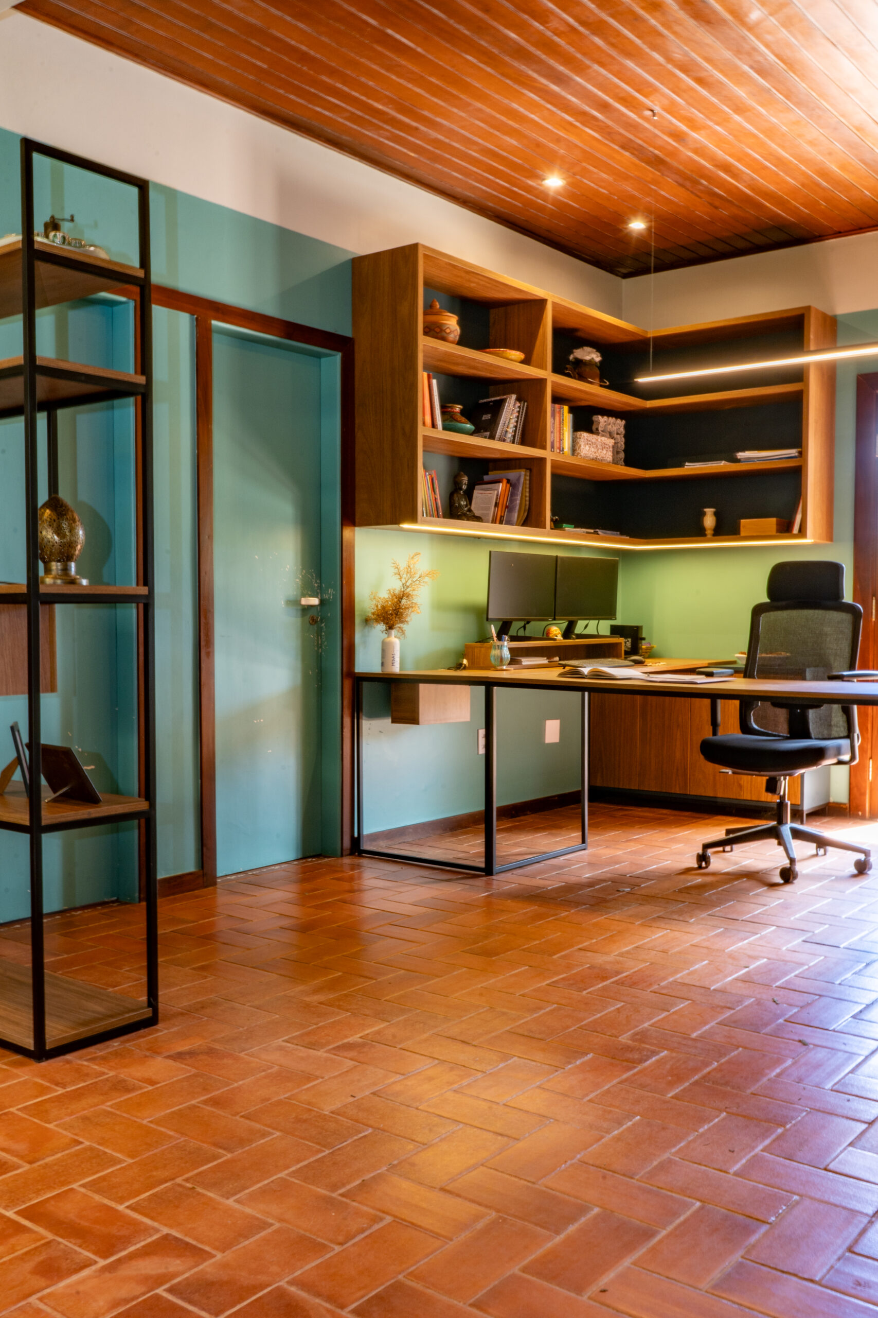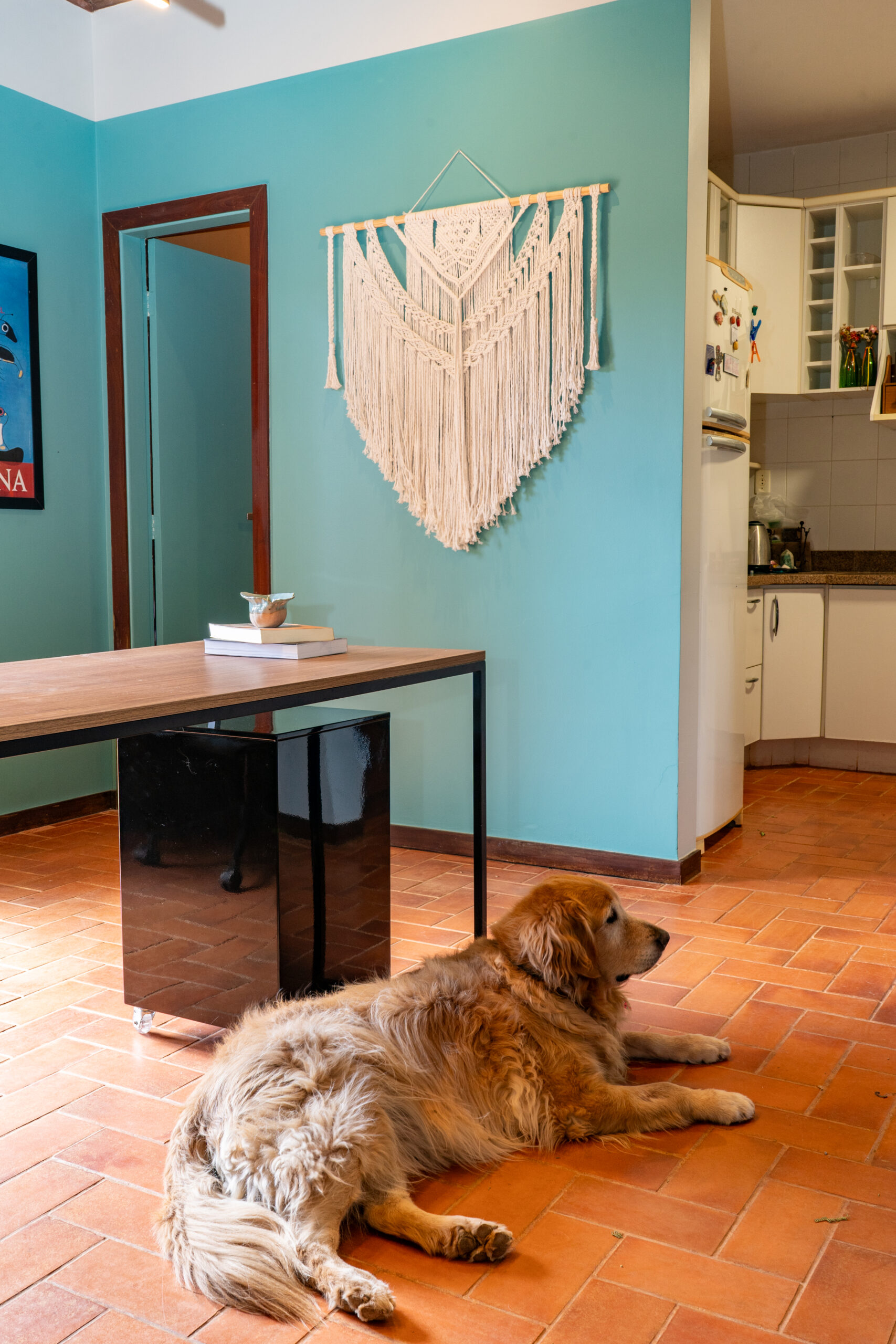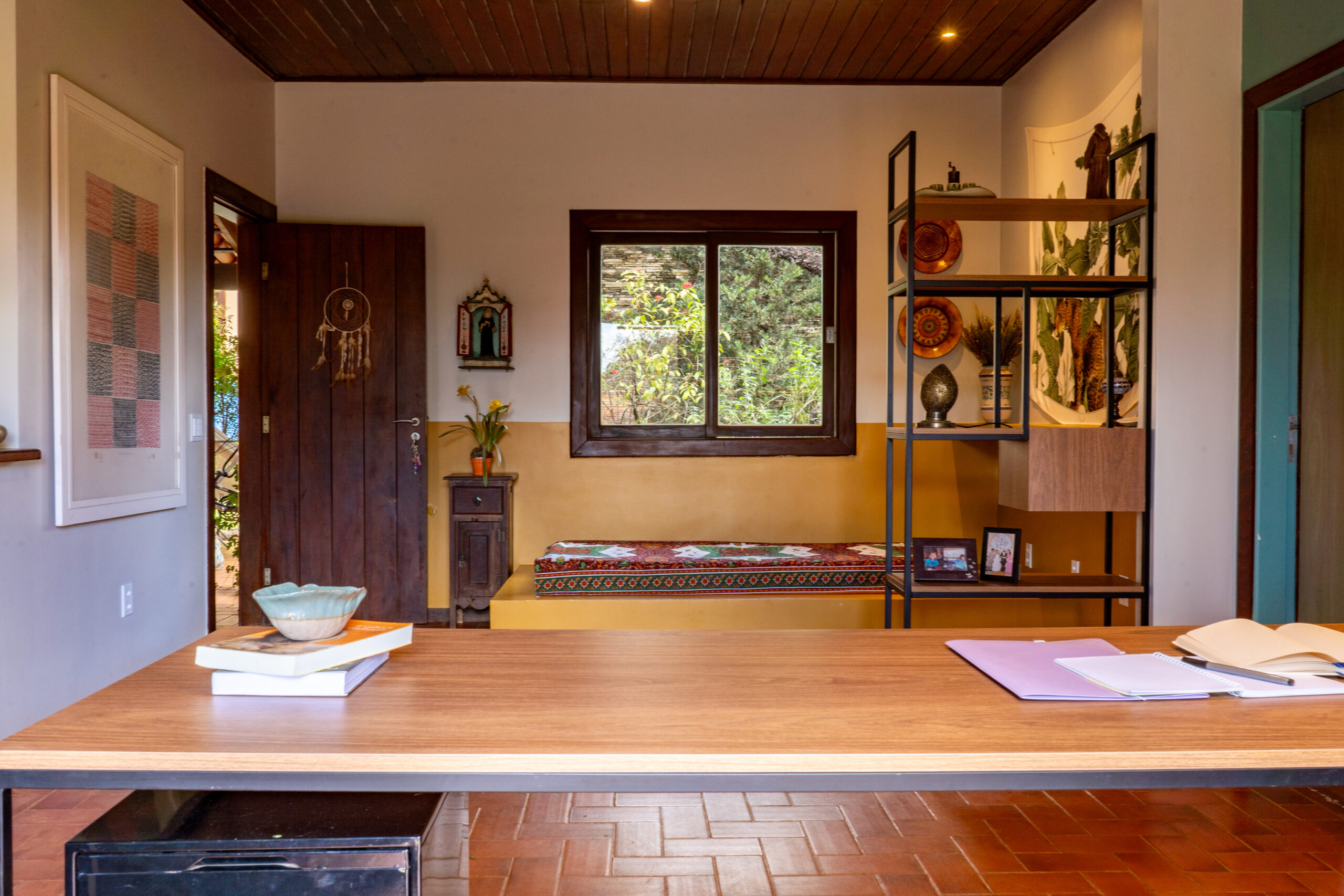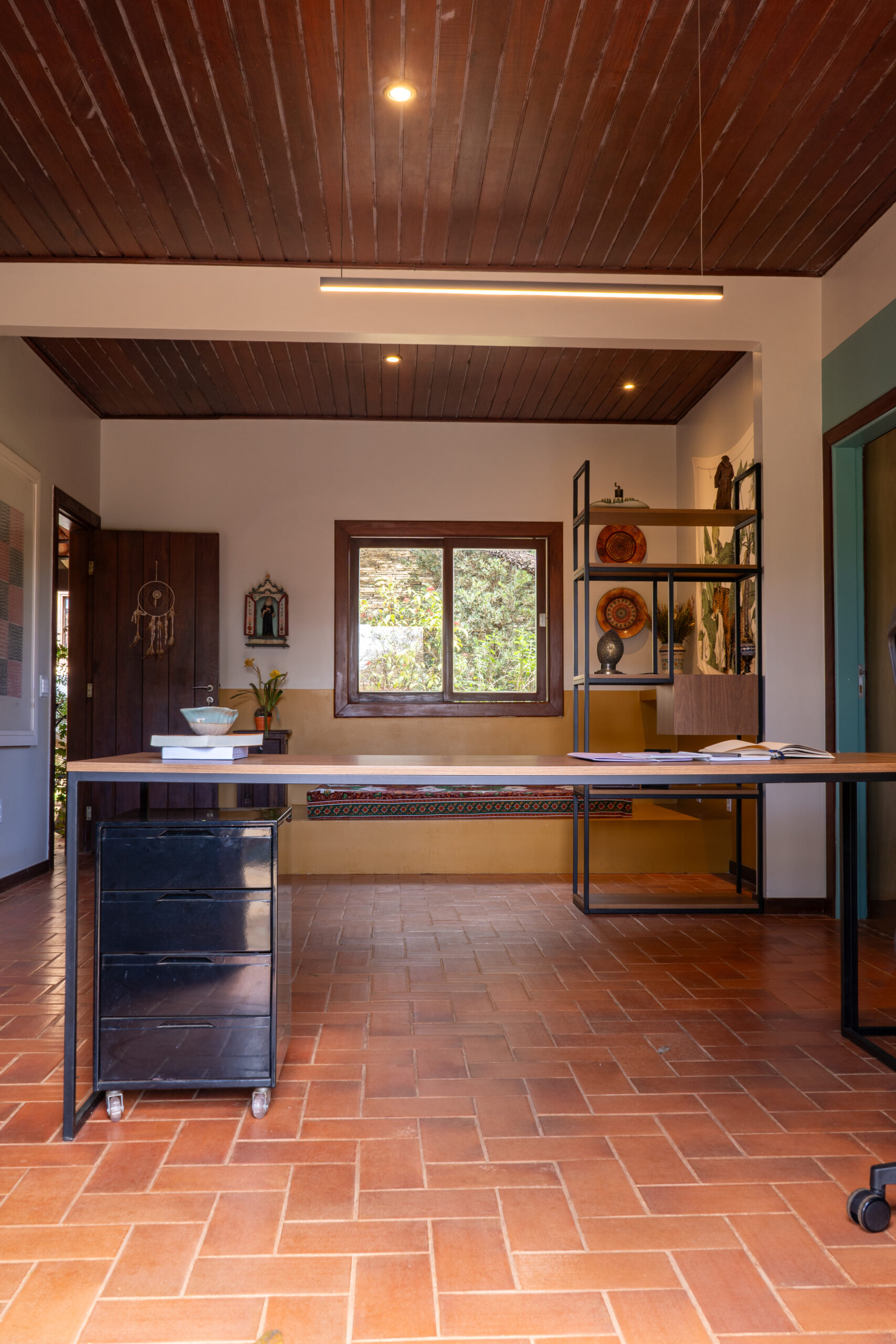 O pedido veio de querer transformar o atual espaço de trabalho, que já foi a primeira casa ocupada pela família no terreno, em um escritório mais organizado, bonito e acolhedor mas não apenas para ela, como também para sua família canina. Além da sala de estar, essa pequena casa conta com uma cozinha, que não foi alterada e mais dois quartos. Um deles virou a sala de tv e o outro seguiu sendo um quarto de hóspedes. No lugar onde antes era a sala de tv integrada na sala de estar/escritório, ficou o cantinho dos cachorros. Um sofá de alvenaria baixo que eles ocupam enquanto sua tutora trabalha, no novo mobiliário do escritório todo projetada para ela. Um mesa ampla em L com espaço para trabalho no computador e fora dele, e uma grande estante para os diversos livros que estavam sem organização.