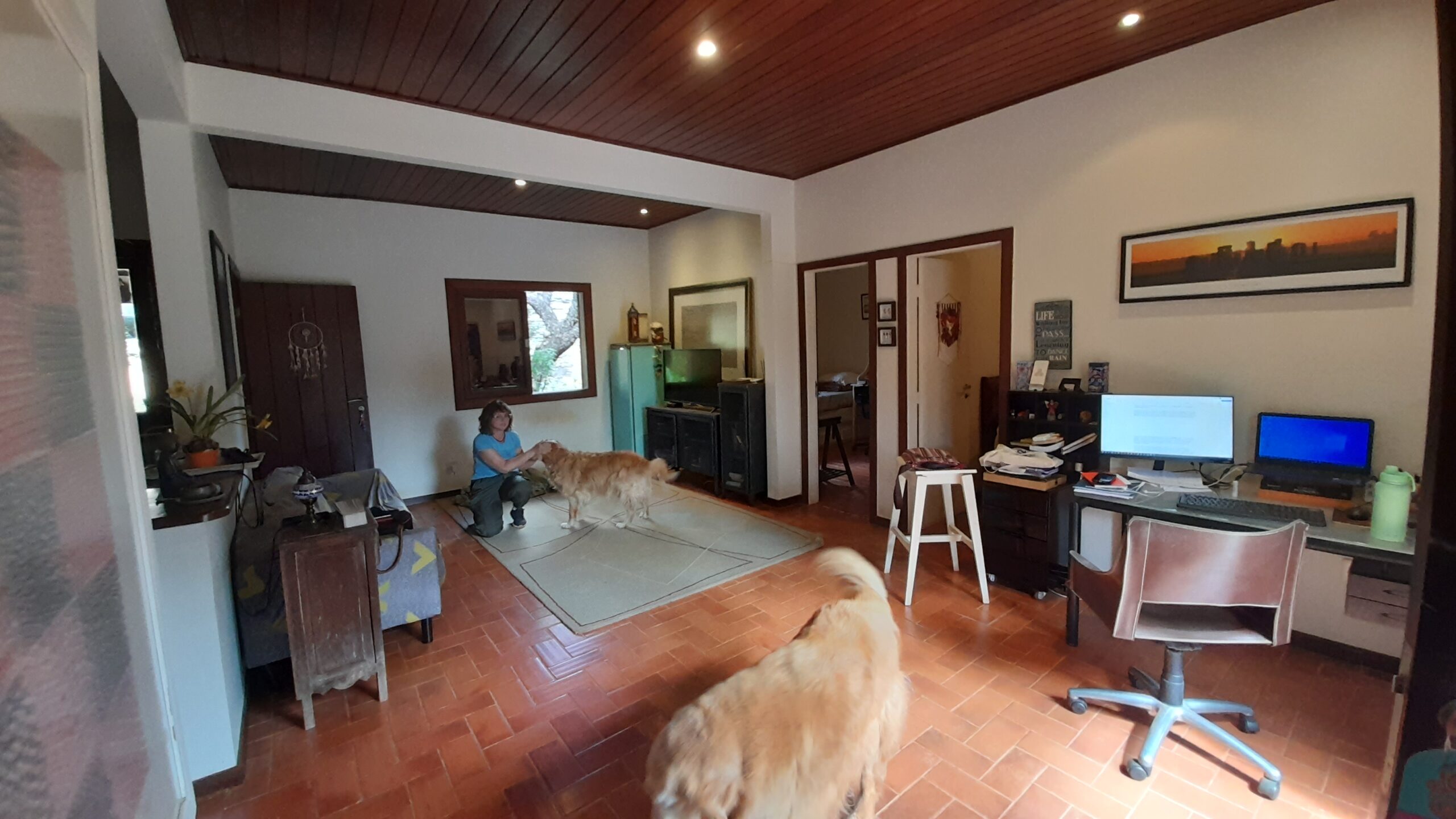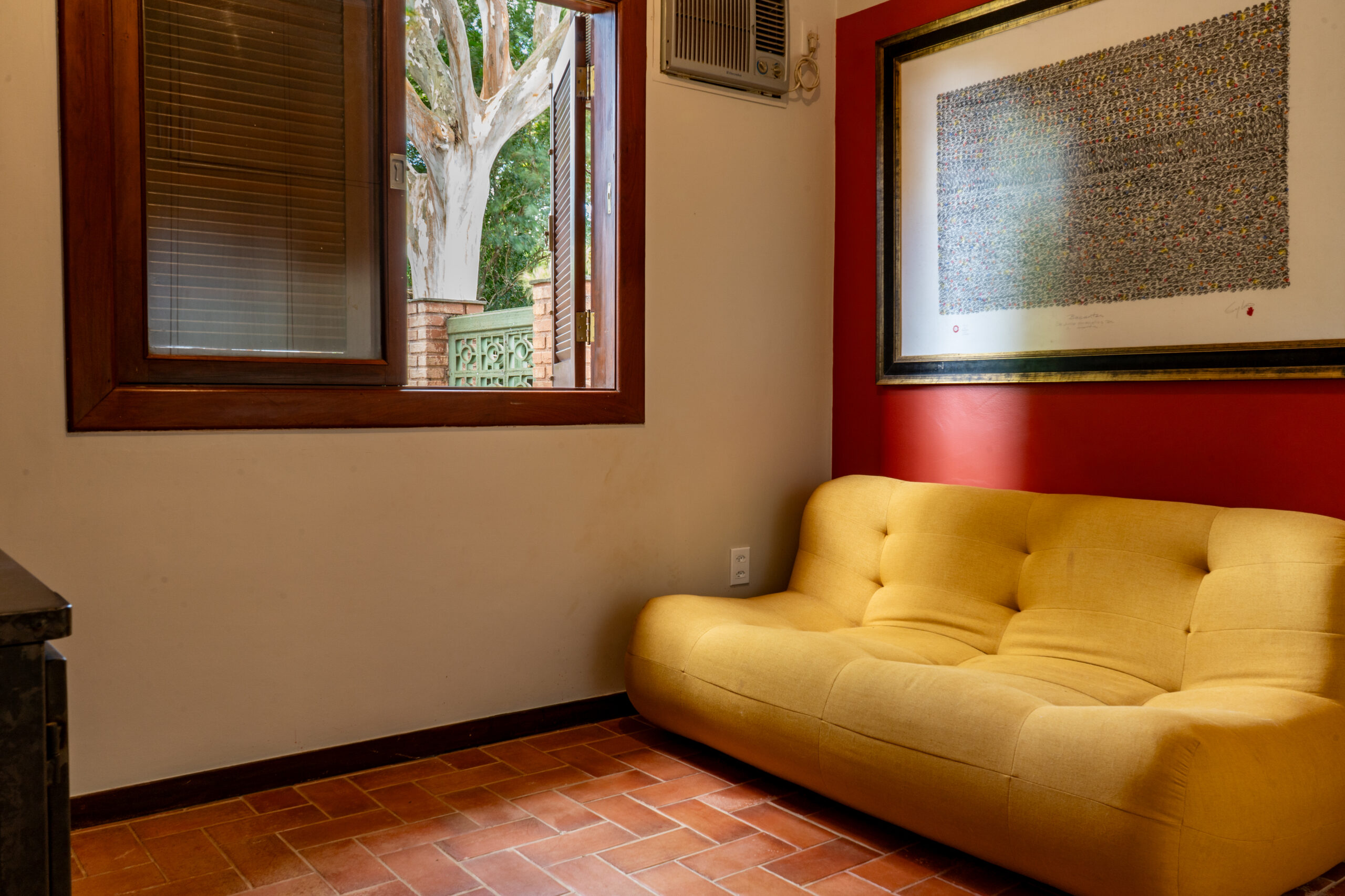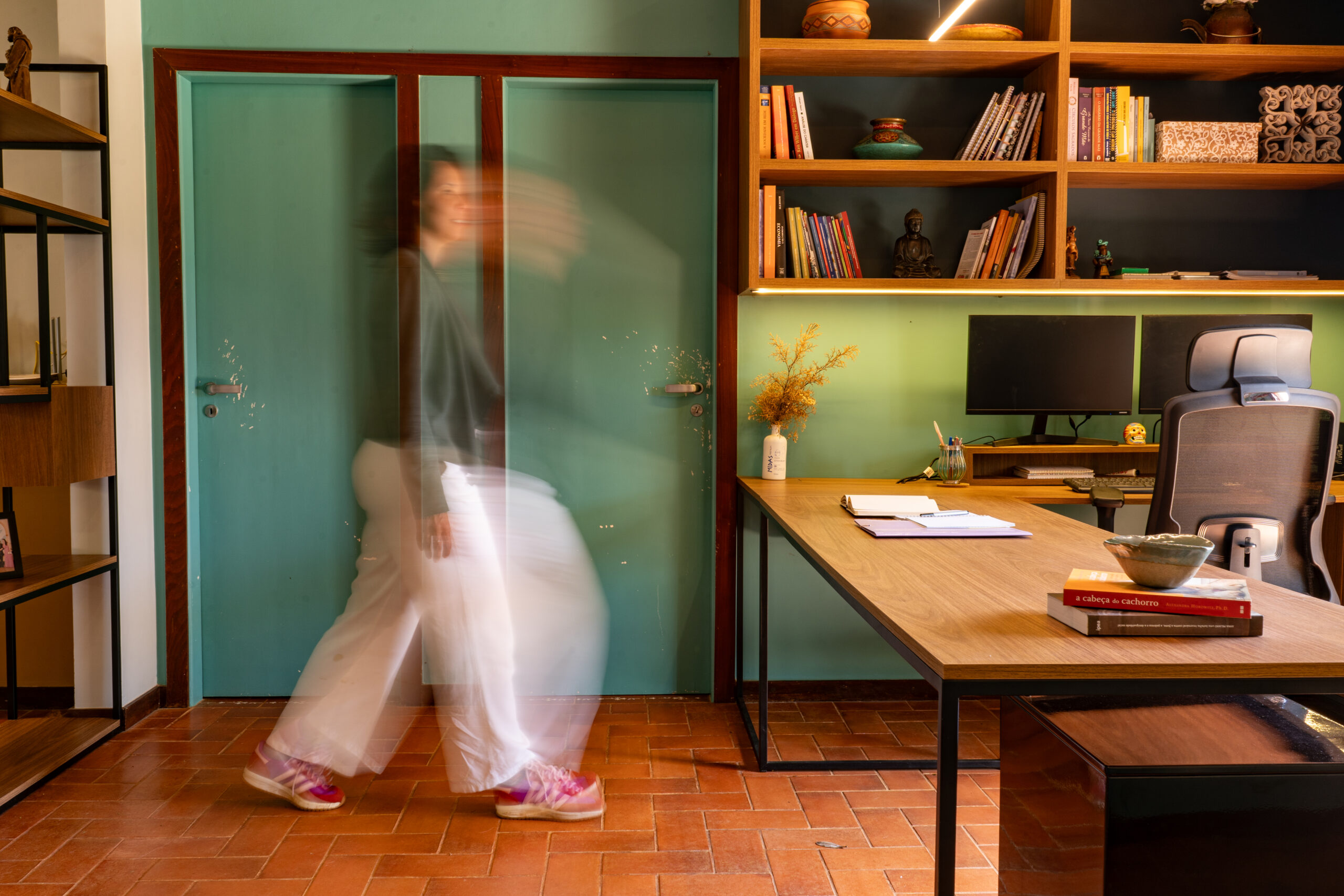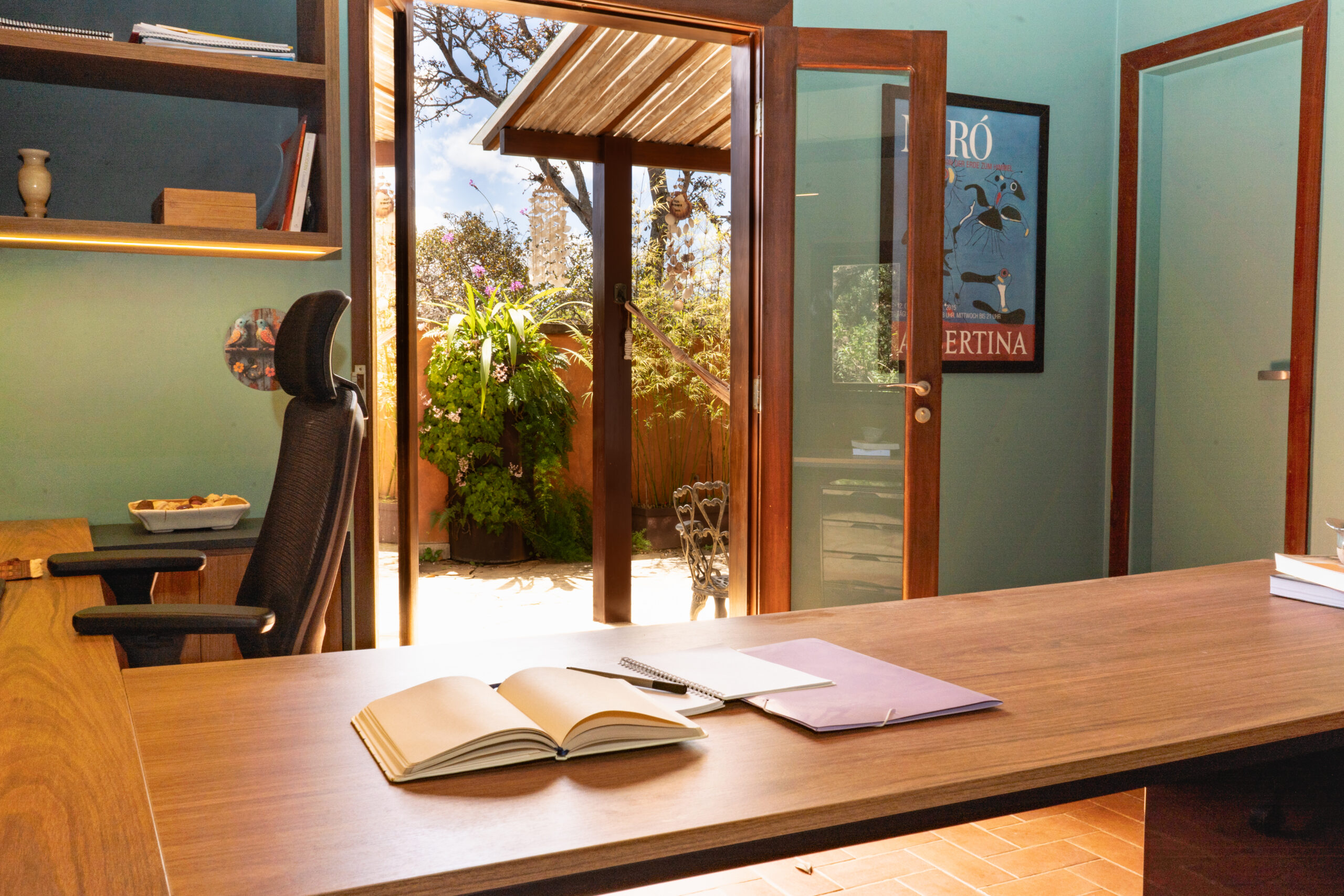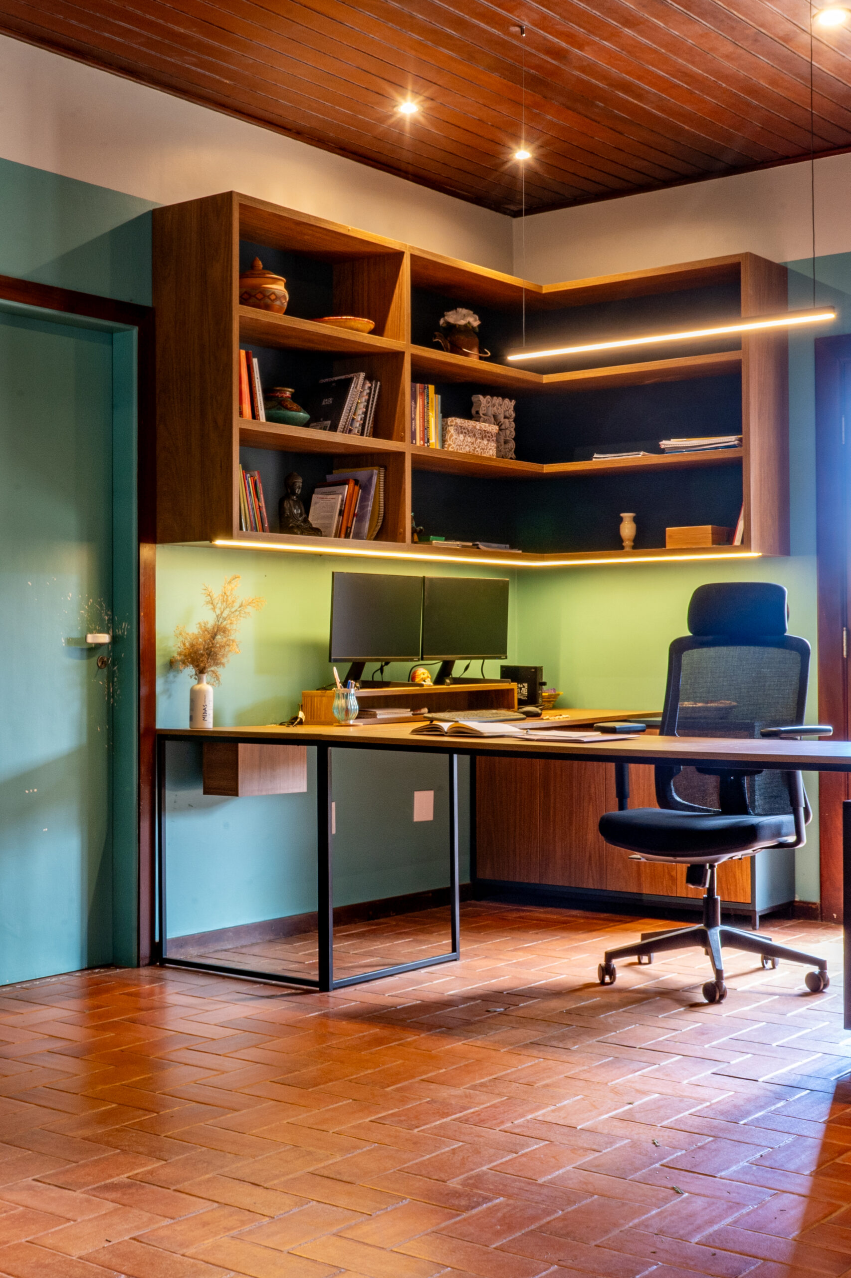 O pedido veio de querer transformar o atual espaço de trabalho, que já foi a primeira casa ocupada pela família no terreno, em um escritório mais organizado, bonito e acolhedor mas não apenas para ela, como também para sua família canina. Além da sala de estar, essa pequena casa conta com uma cozinha, que não foi alterada e mais dois quartos. Um deles virou a sala de tv e o outro seguiu sendo um quarto de hóspedes. No lugar onde antes era a sala de tv integrada na sala de estar/escritório, ficou o cantinho dos cachorros. Um sofá de alvenaria baixo que eles ocupam enquanto sua tutora trabalha, no novo mobiliário do escritório todo projetada para ela. Um mesa ampla em L com espaço para trabalho no computador e fora dele, e uma grande estante para os diversos livros que estavam sem organização.