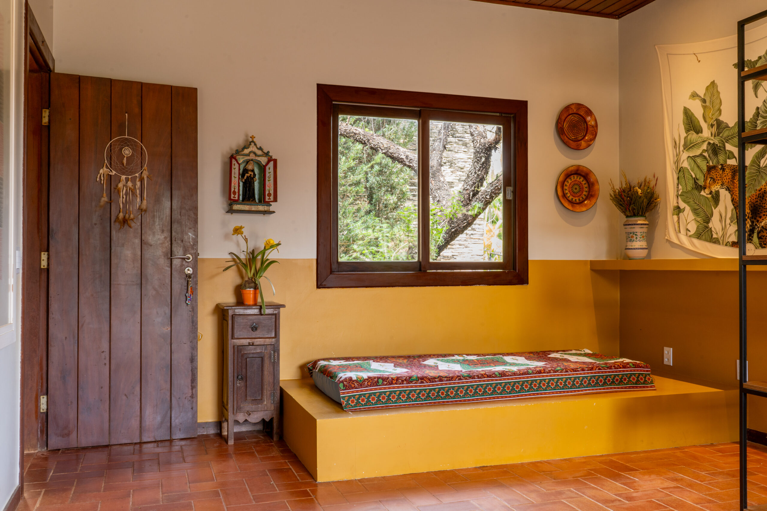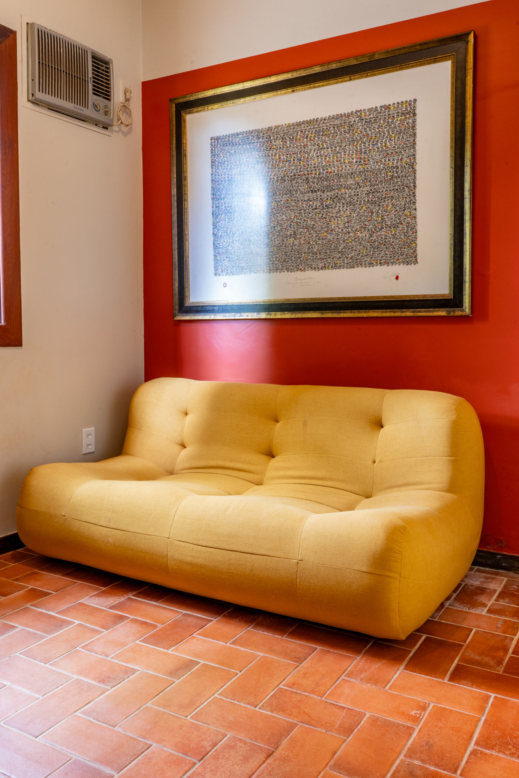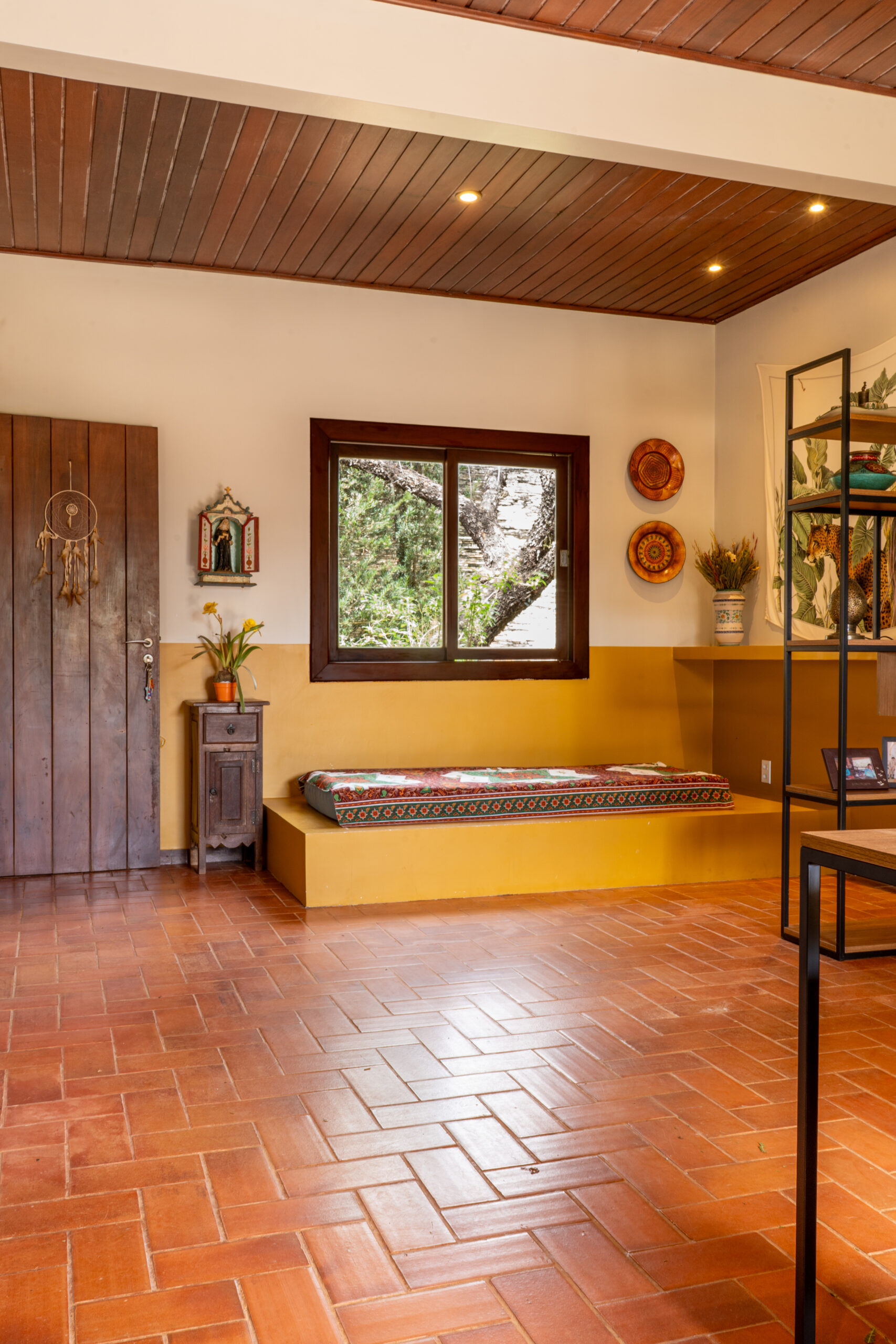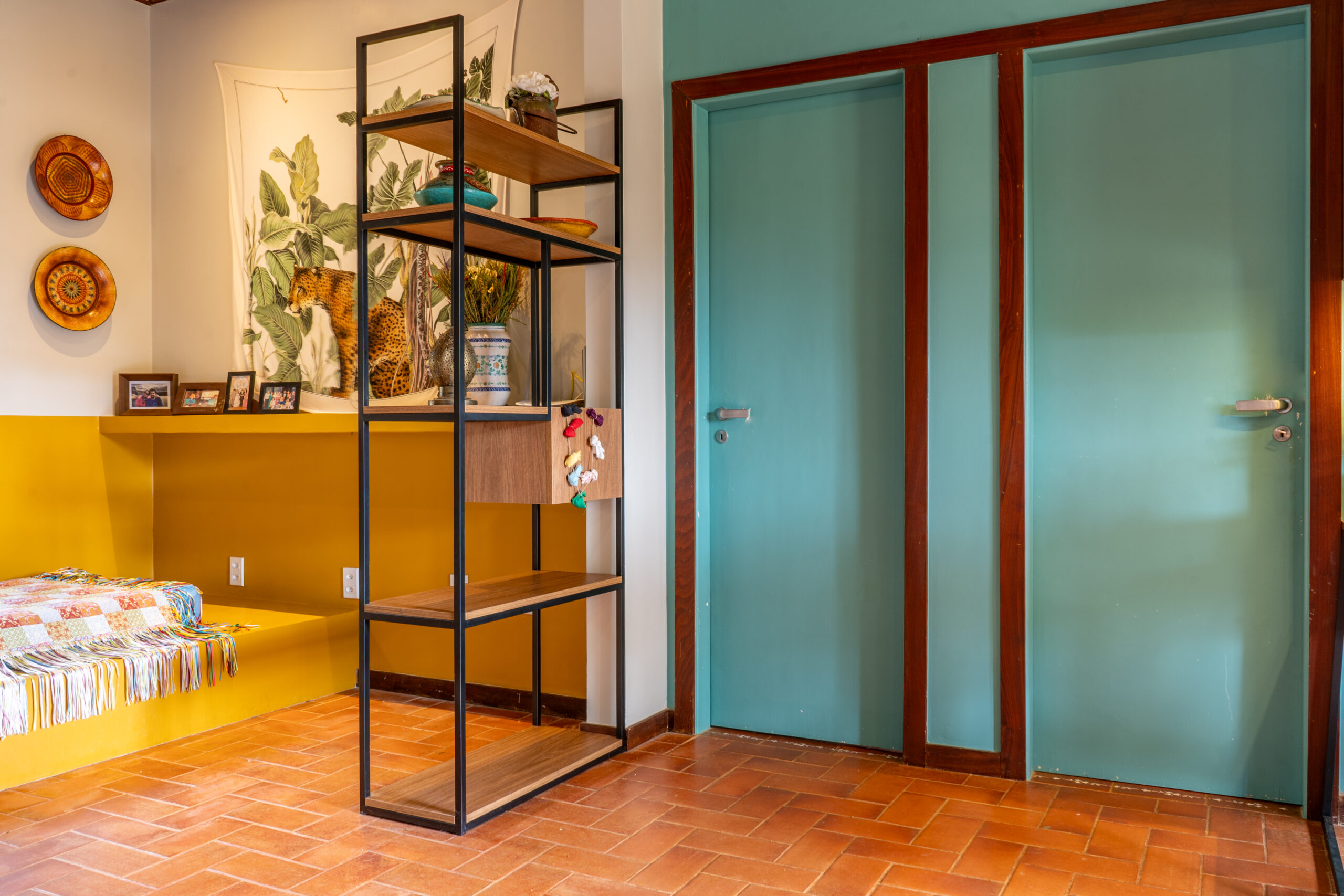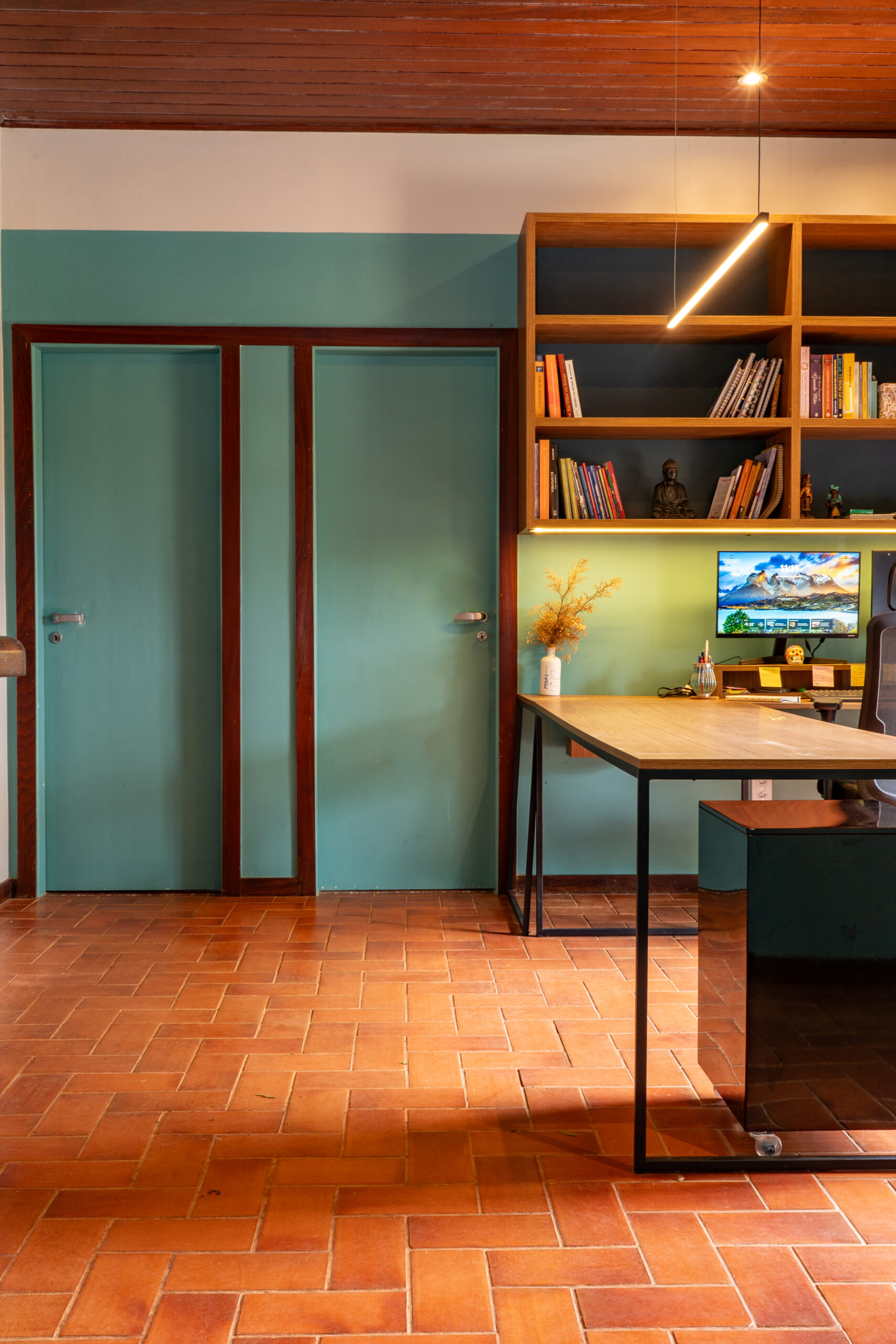 O pedido veio de querer transformar o atual espaço de trabalho, que já foi a primeira casa ocupada pela família no terreno, em um escritório mais organizado, bonito e acolhedor mas não apenas para ela, como também para sua família canina. Além da sala de estar, essa pequena casa conta com uma cozinha, que não foi alterada e mais dois quartos. Um deles virou a sala de tv e o outro seguiu sendo um quarto de hóspedes. No lugar onde antes era a sala de tv integrada na sala de estar/escritório, ficou o cantinho dos cachorros. Um sofá de alvenaria baixo que eles ocupam enquanto sua tutora trabalha, no novo mobiliário do escritório todo projetada para ela. Um mesa ampla em L com espaço para trabalho no computador e fora dele, e uma grande estante para os diversos livros que estavam sem organização.
