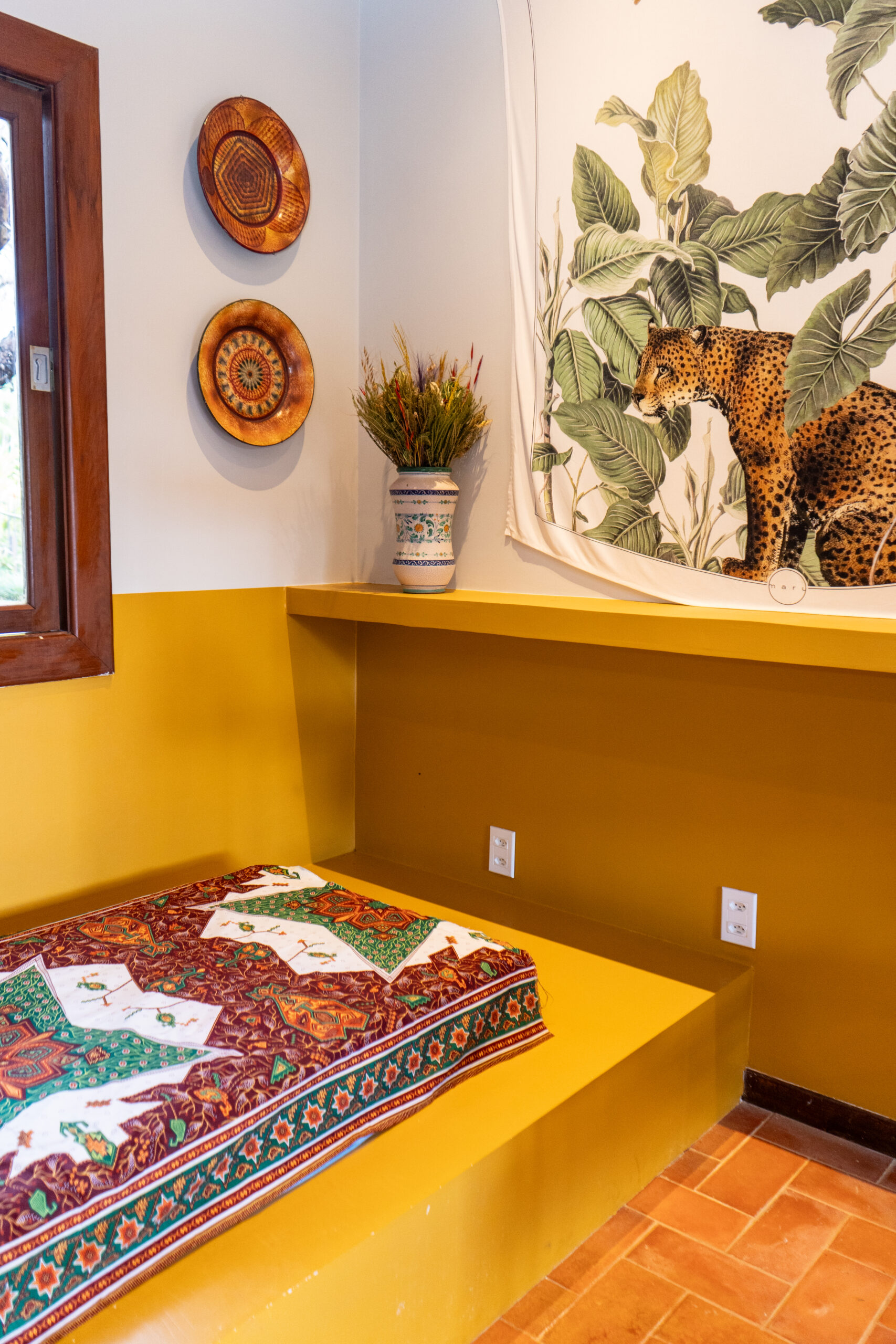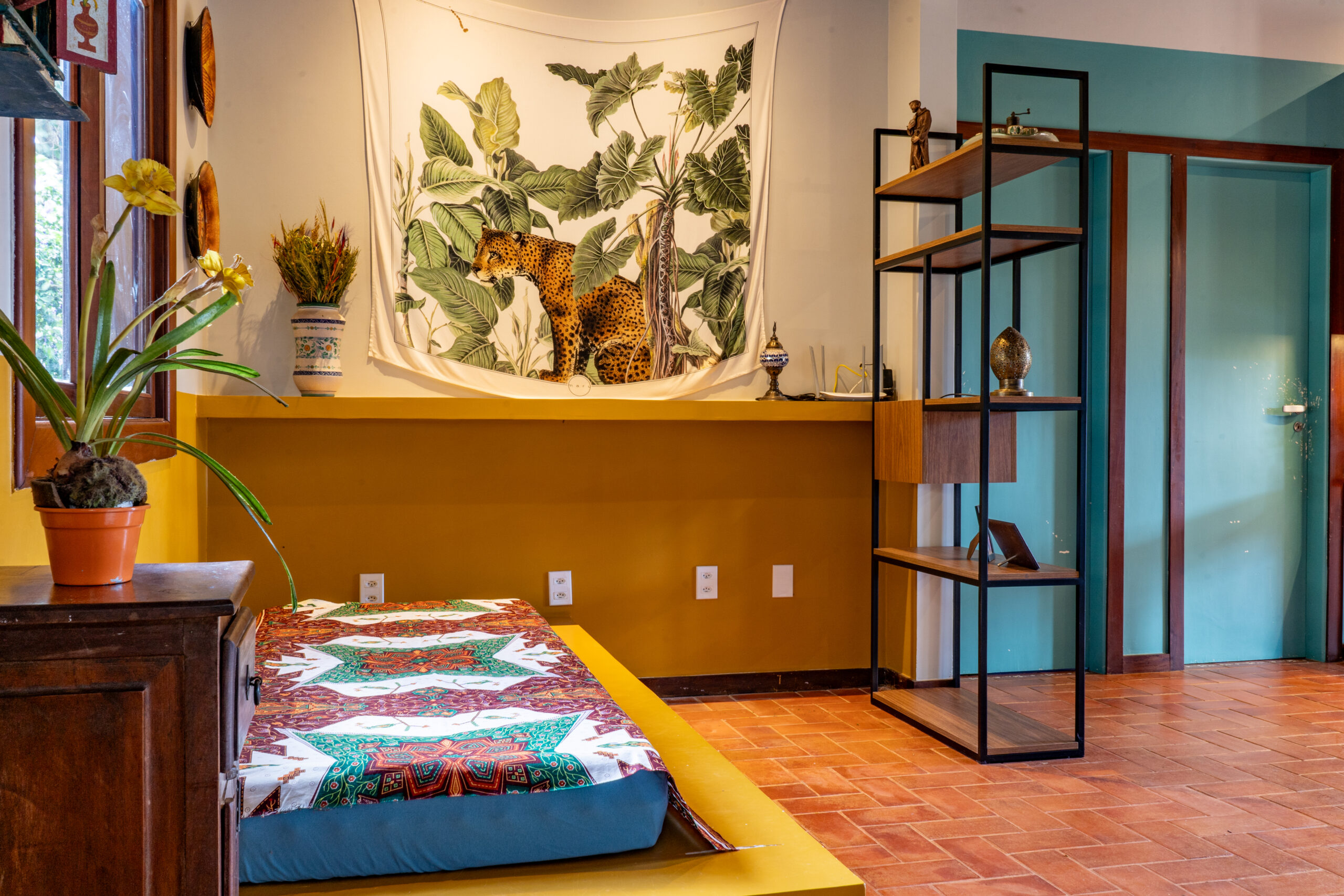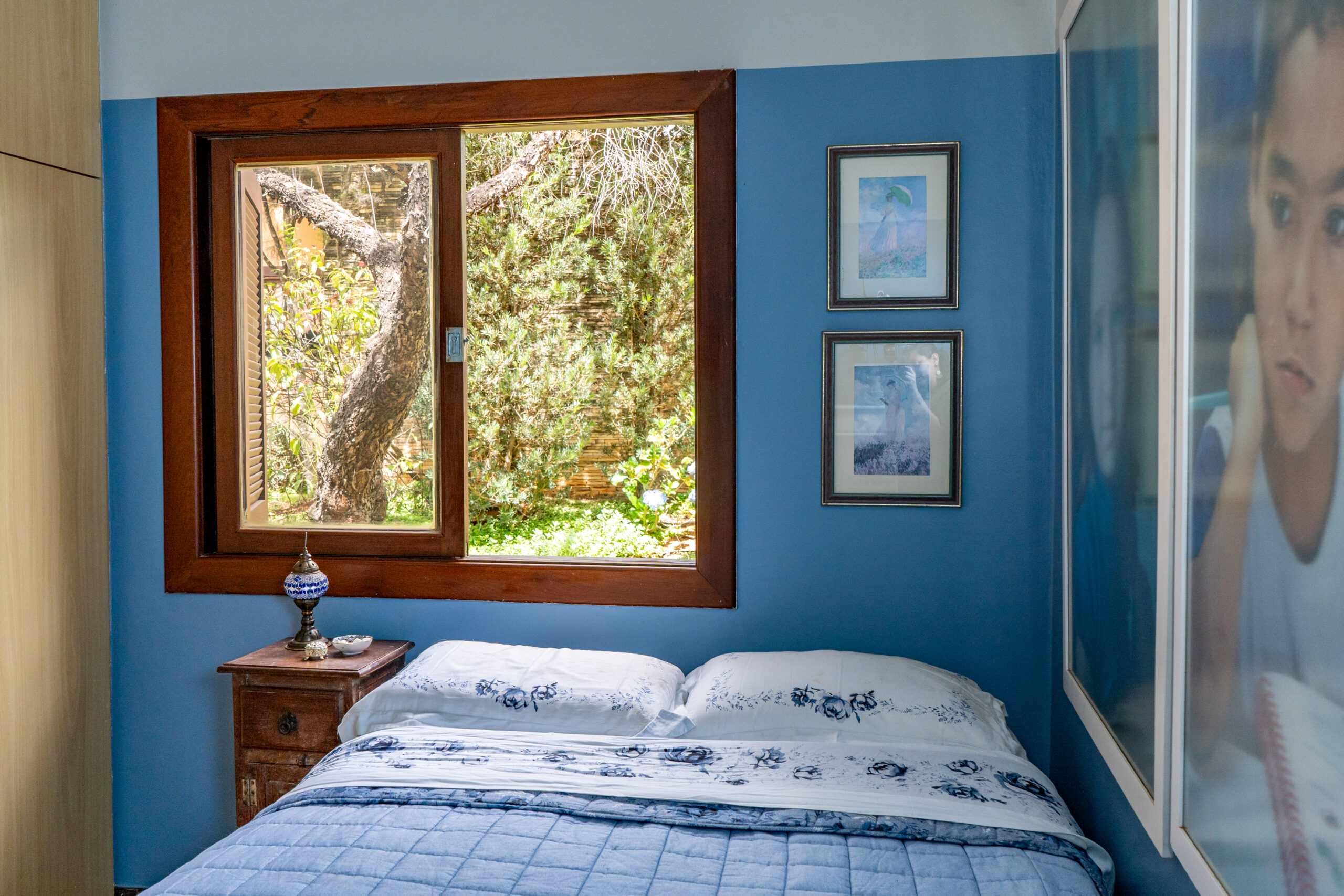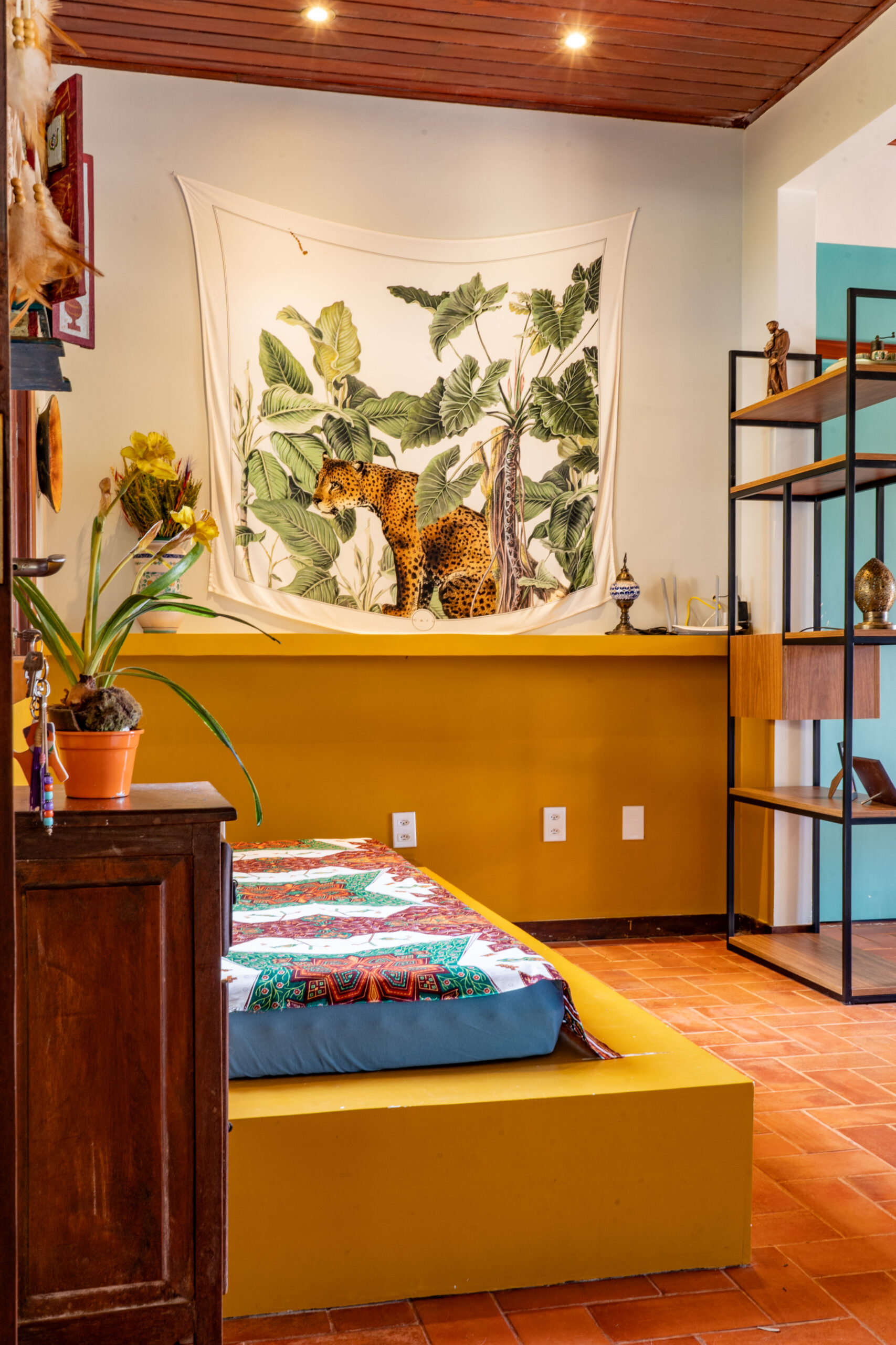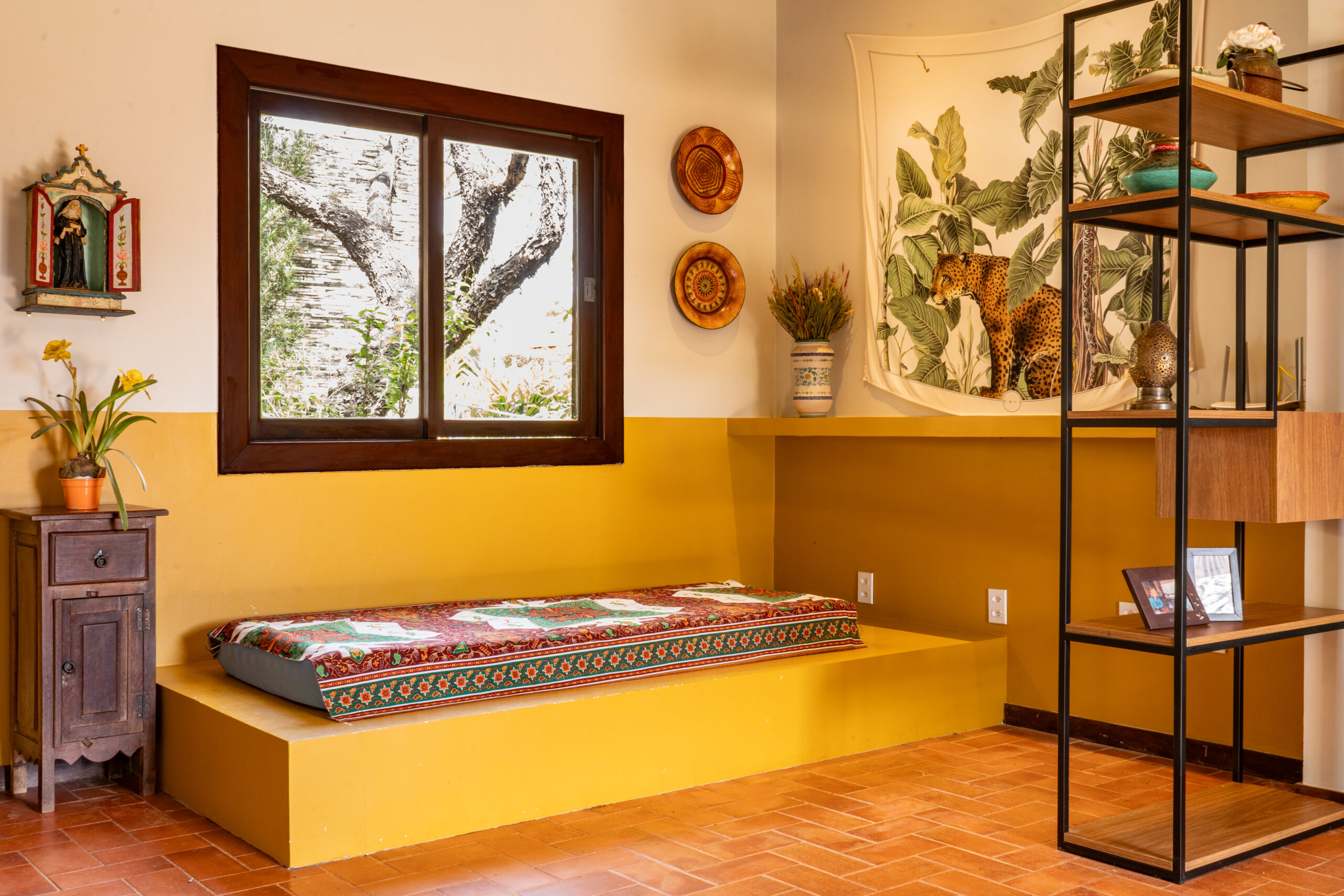O pedido veio de querer transformar o atual espaço de trabalho, que já foi a primeira casa ocupada pela família no terreno, em um escritório mais organizado, bonito e acolhedor mas não apenas para ela, como também para sua família canina. Além da sala de estar, essa pequena casa conta com uma cozinha, que não foi alterada e mais dois quartos. Um deles virou a sala de tv e o outro seguiu sendo um quarto de hóspedes. No lugar onde antes era a sala de tv integrada na sala de estar/escritório, ficou o cantinho dos cachorros. Um sofá de alvenaria baixo que eles ocupam enquanto sua tutora trabalha, no novo mobiliário do escritório todo projetada para ela. Um mesa ampla em L com espaço para trabalho no computador e fora dele, e uma grande estante para os diversos livros que estavam sem organização.