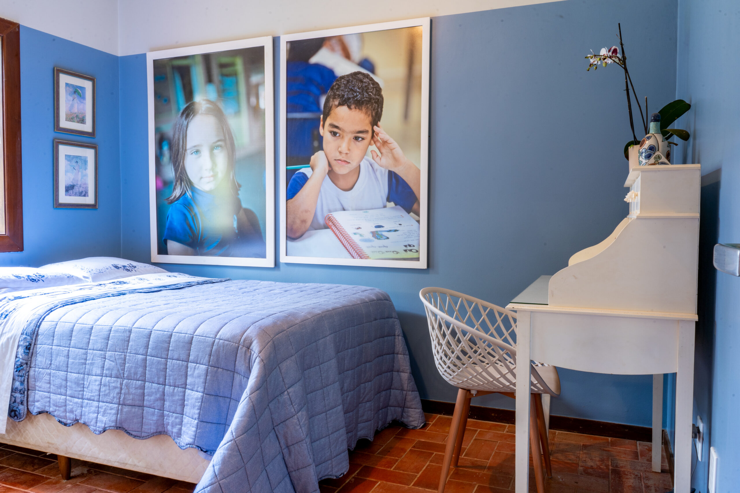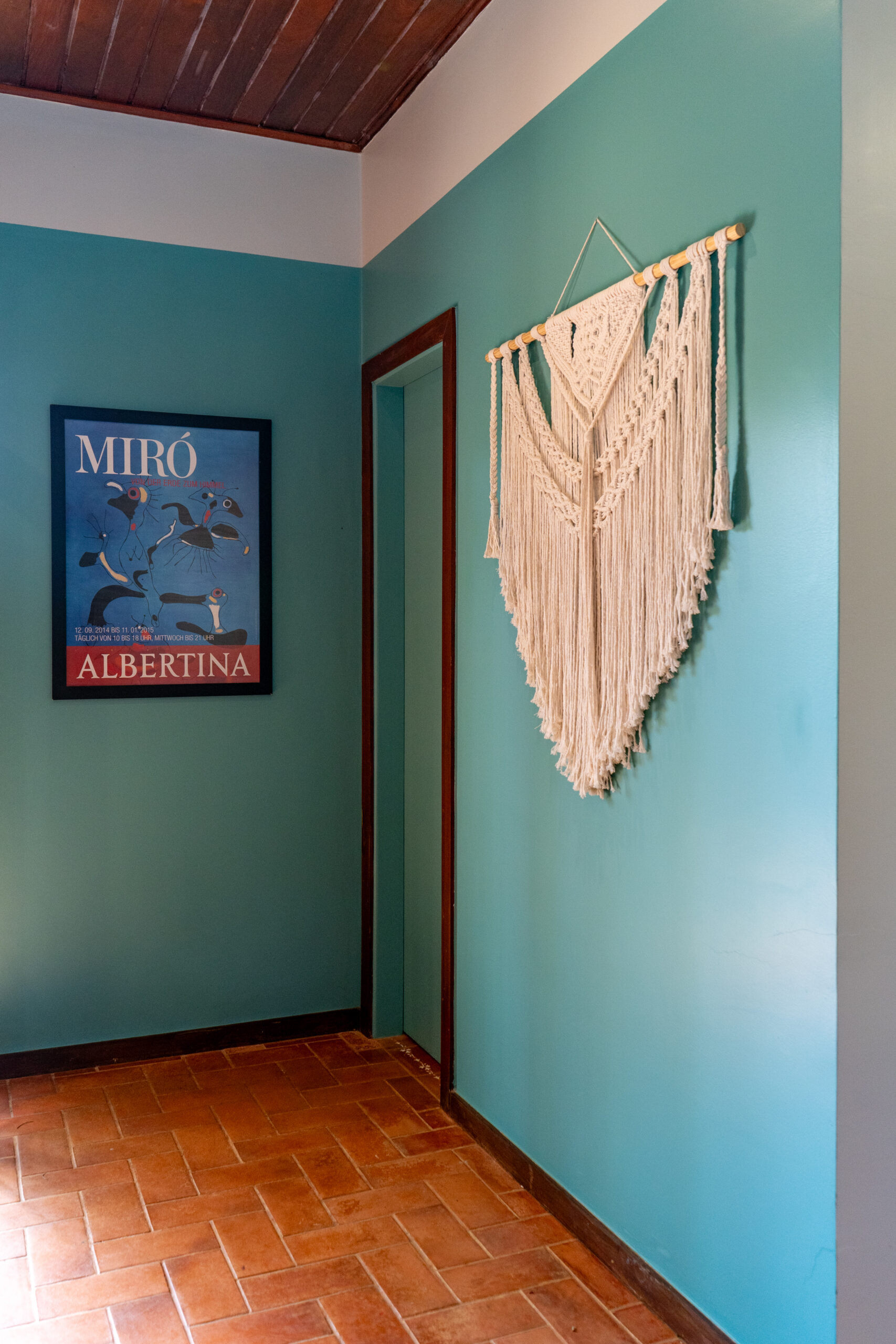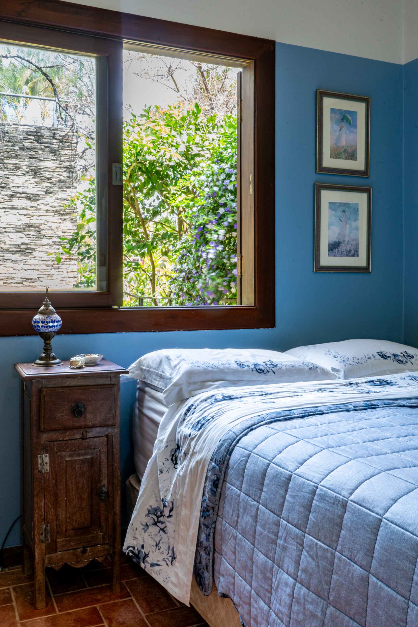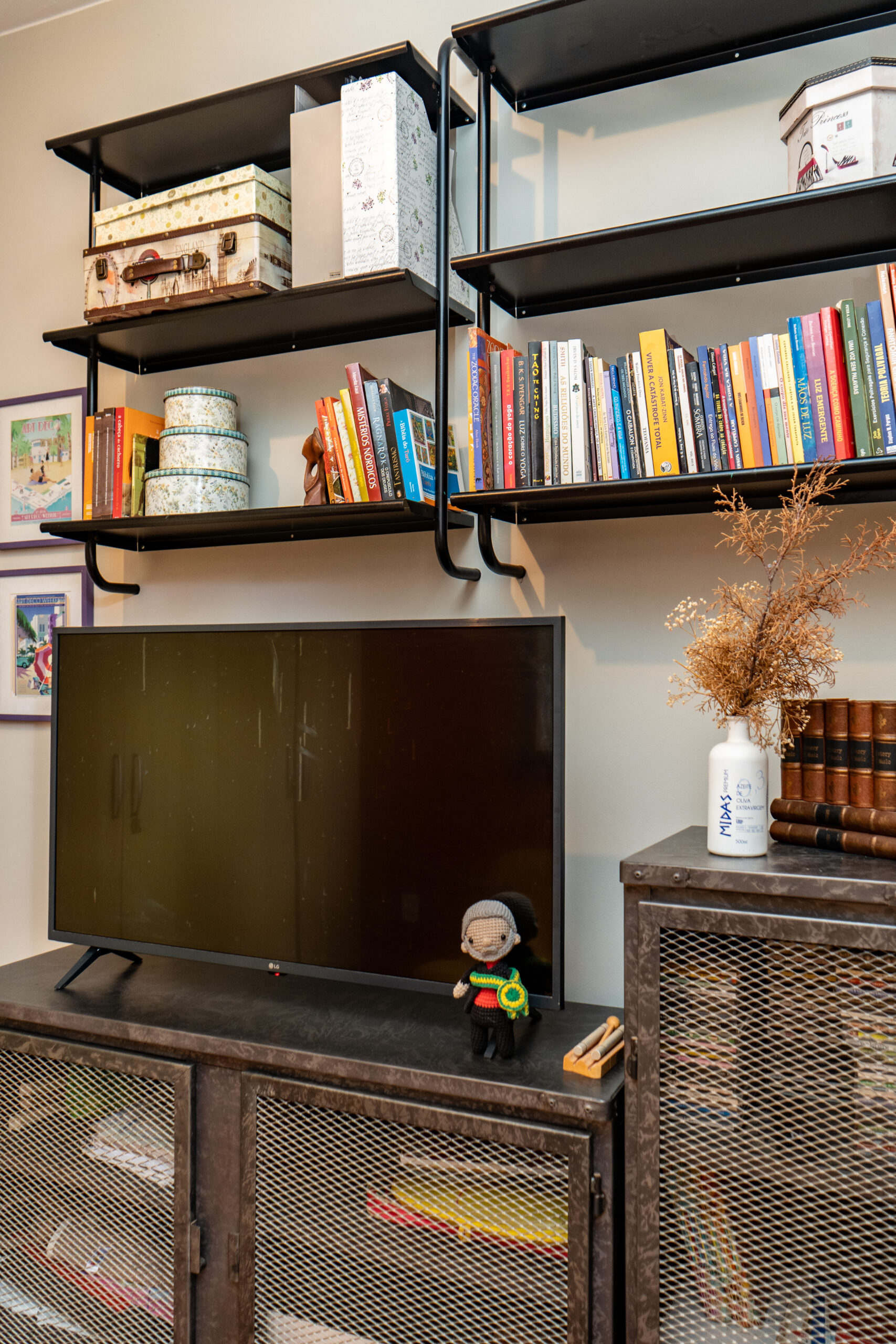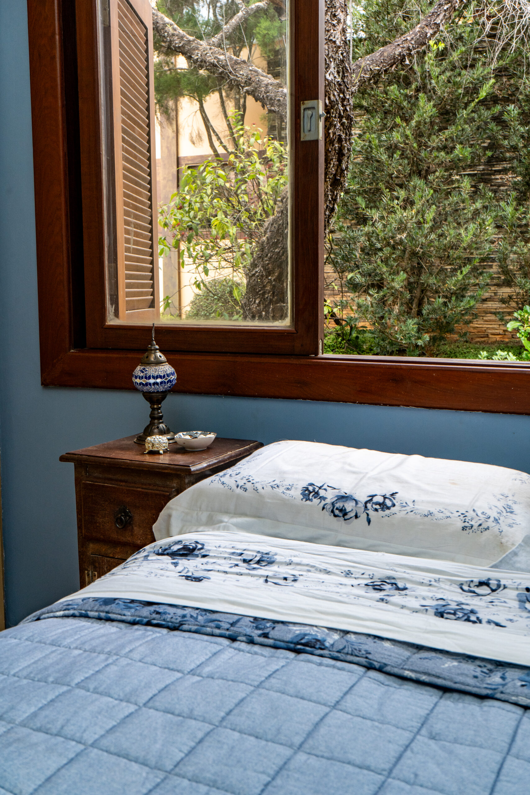 O pedido veio de querer transformar o atual espaço de trabalho, que já foi a primeira casa ocupada pela família no terreno, em um escritório mais organizado, bonito e acolhedor mas não apenas para ela, como também para sua família canina. Além da sala de estar, essa pequena casa conta com uma cozinha, que não foi alterada e mais dois quartos. Um deles virou a sala de tv e o outro seguiu sendo um quarto de hóspedes. No lugar onde antes era a sala de tv integrada na sala de estar/escritório, ficou o cantinho dos cachorros. Um sofá de alvenaria baixo que eles ocupam enquanto sua tutora trabalha, no novo mobiliário do escritório todo projetada para ela. Um mesa ampla em L com espaço para trabalho no computador e fora dele, e uma grande estante para os diversos livros que estavam sem organização.