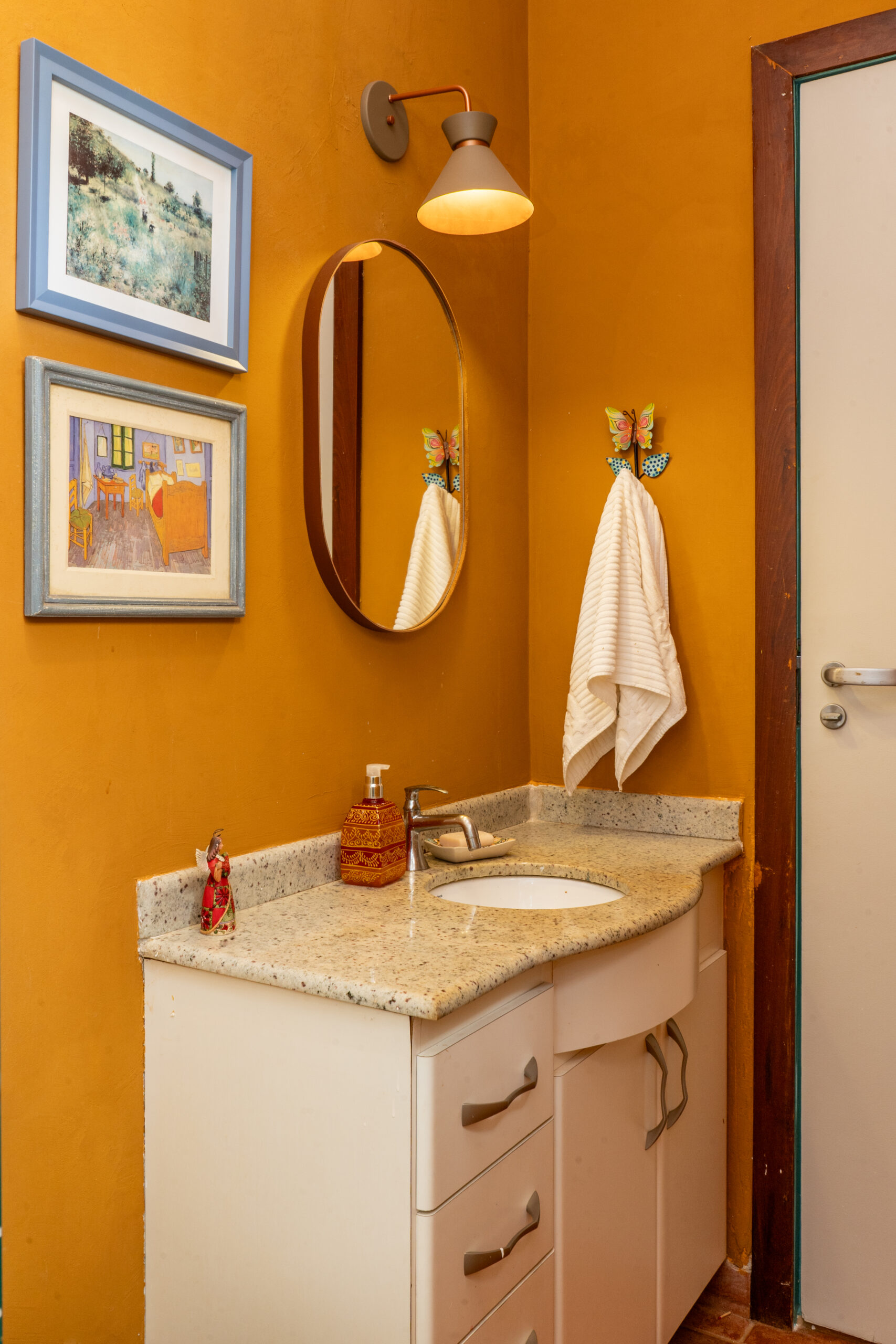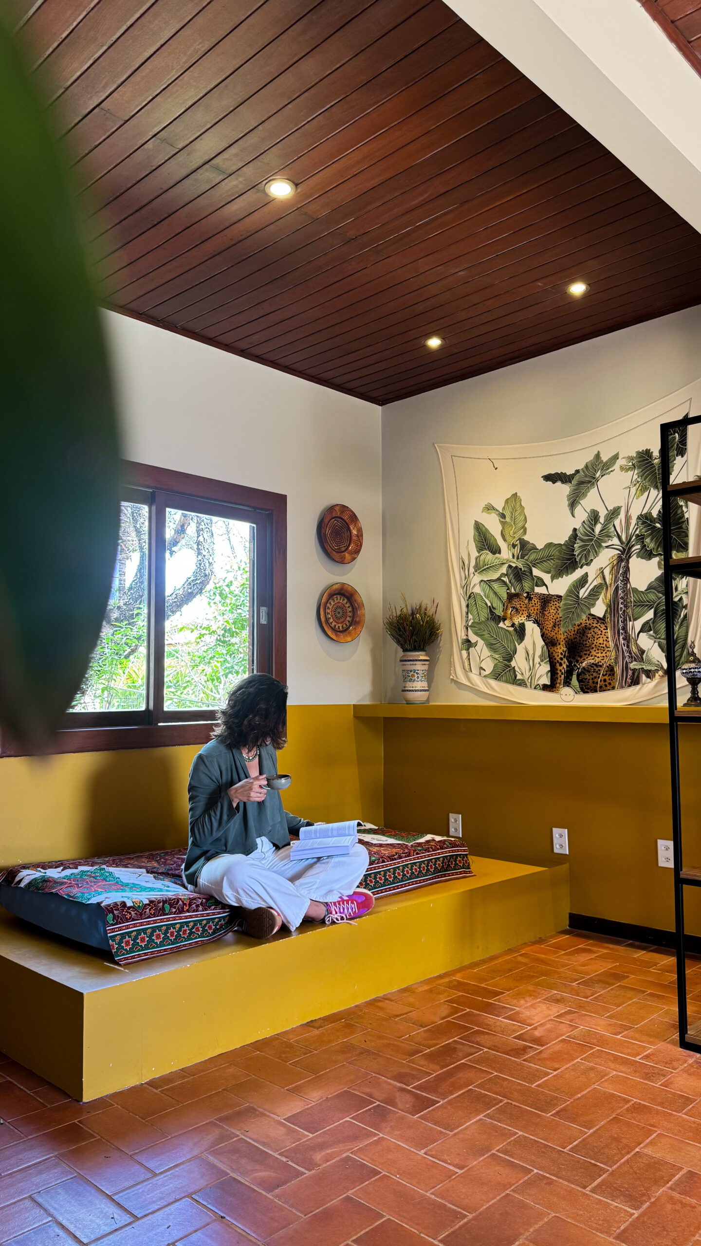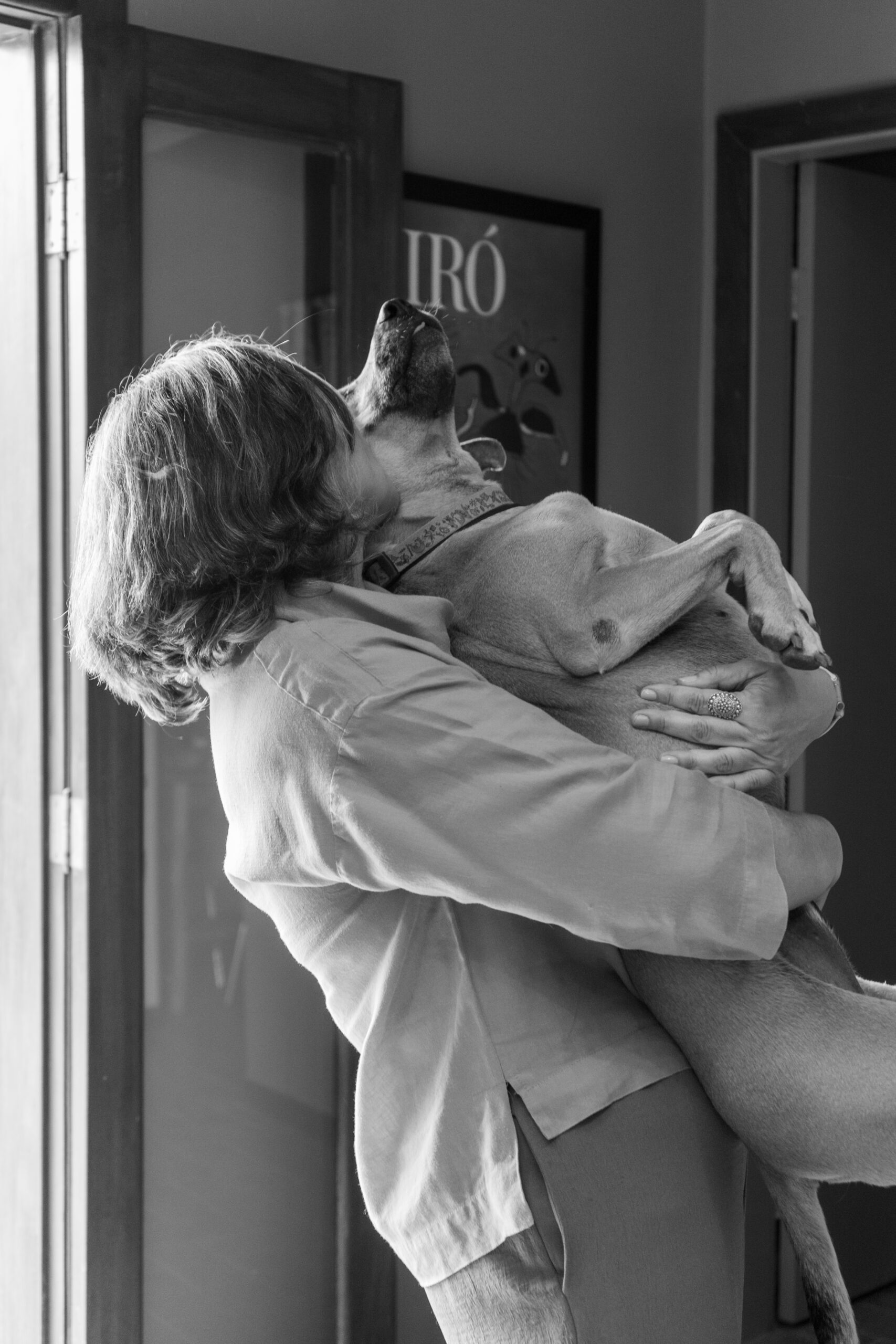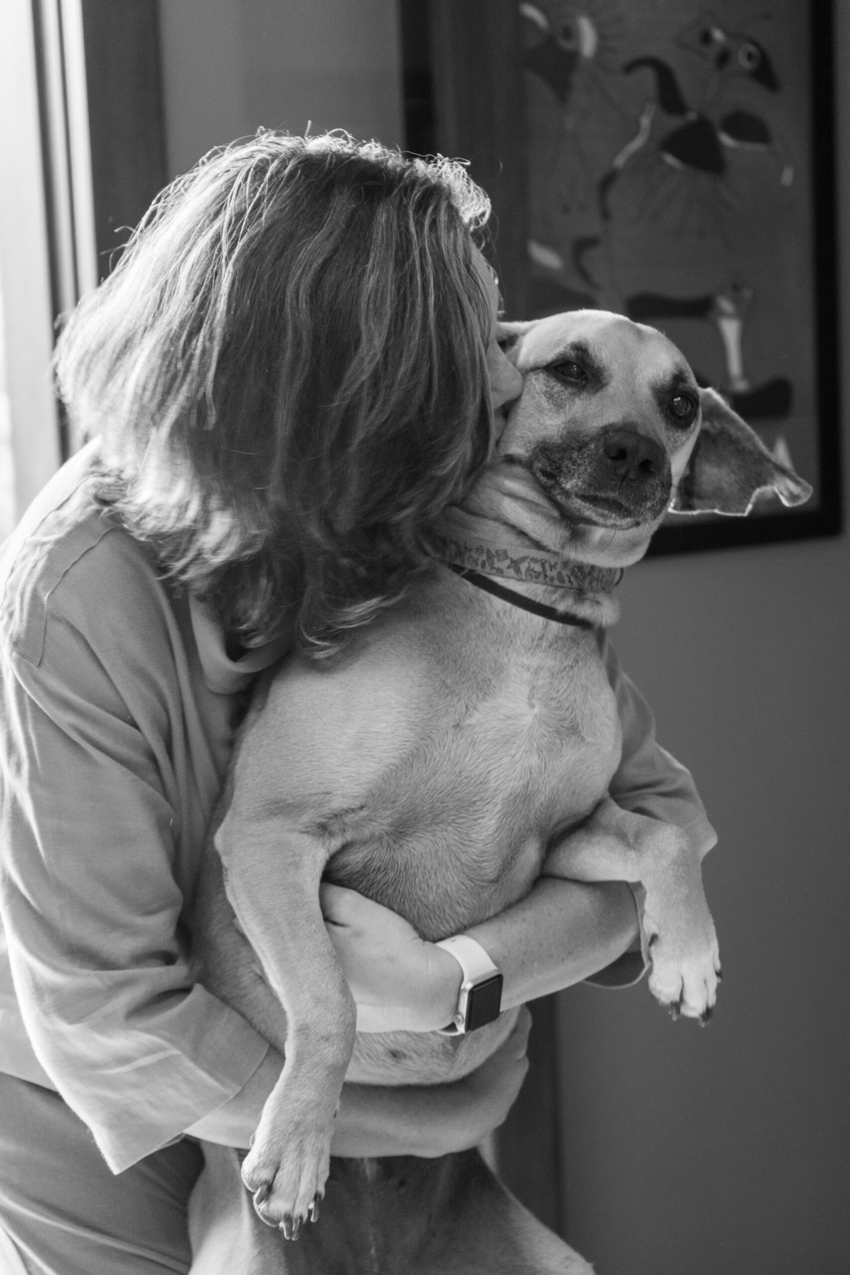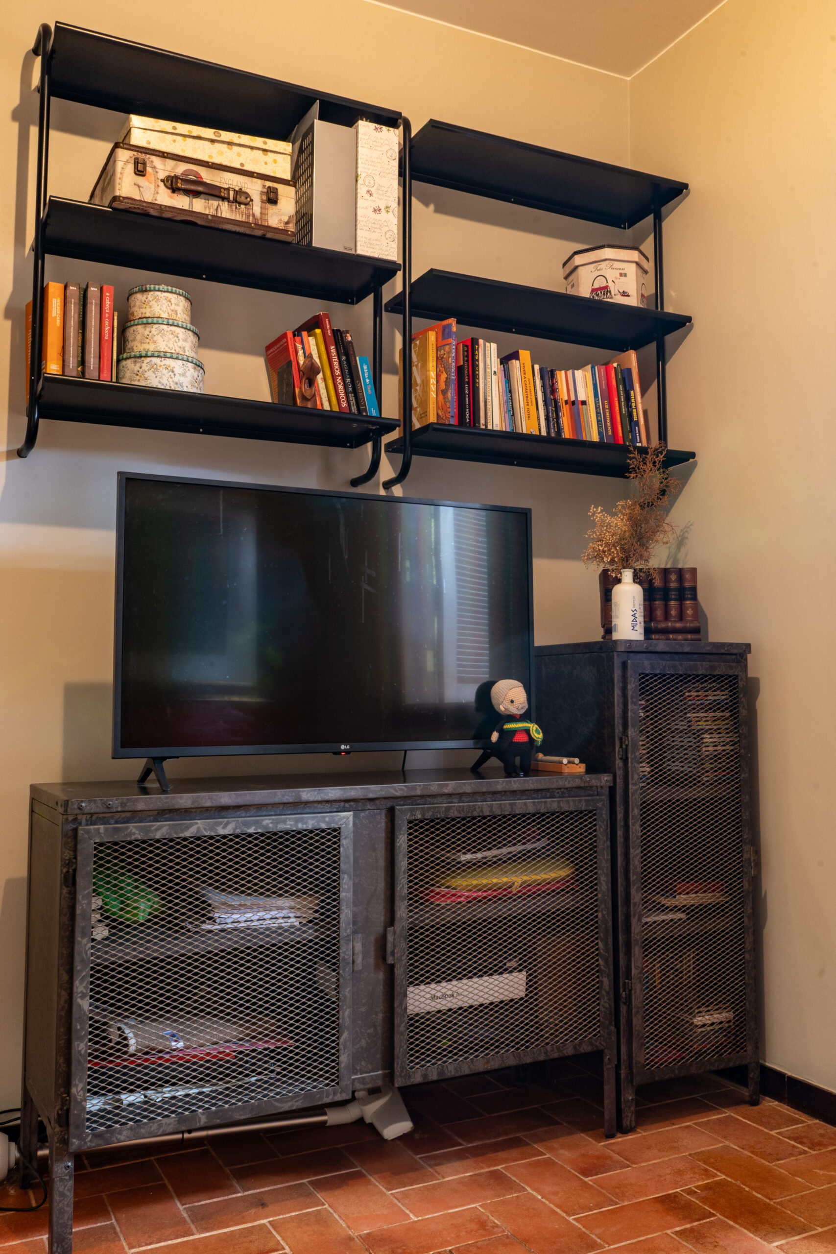 O pedido veio de querer transformar o atual espaço de trabalho, que já foi a primeira casa ocupada pela família no terreno, em um escritório mais organizado, bonito e acolhedor mas não apenas para ela, como também para sua família canina. Além da sala de estar, essa pequena casa conta com uma cozinha, que não foi alterada e mais dois quartos. Um deles virou a sala de tv e o outro seguiu sendo um quarto de hóspedes. No lugar onde antes era a sala de tv integrada na sala de estar/escritório, ficou o cantinho dos cachorros. Um sofá de alvenaria baixo que eles ocupam enquanto sua tutora trabalha, no novo mobiliário do escritório todo projetada para ela. Um mesa ampla em L com espaço para trabalho no computador e fora dele, e uma grande estante para os diversos livros que estavam sem organização.