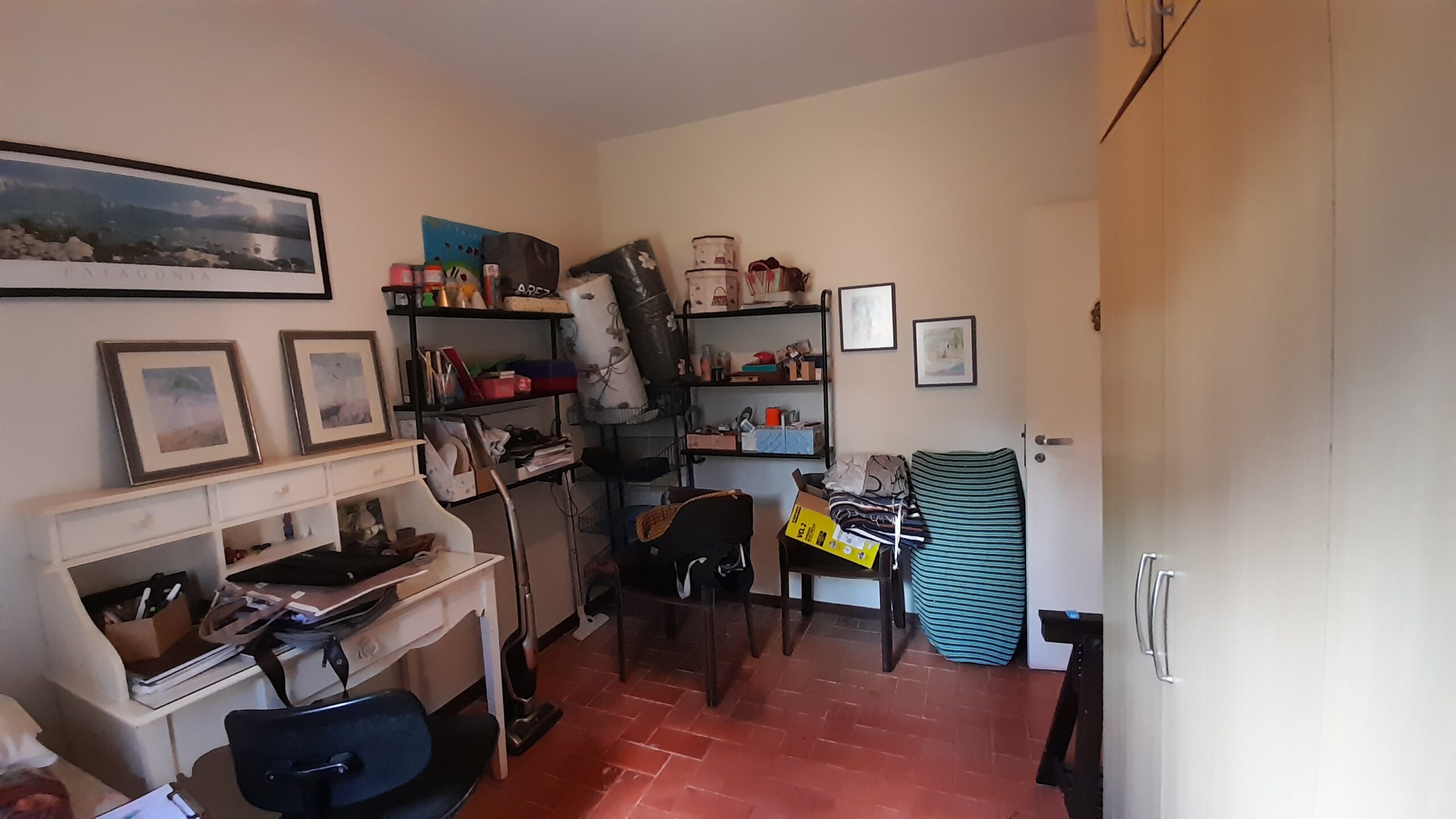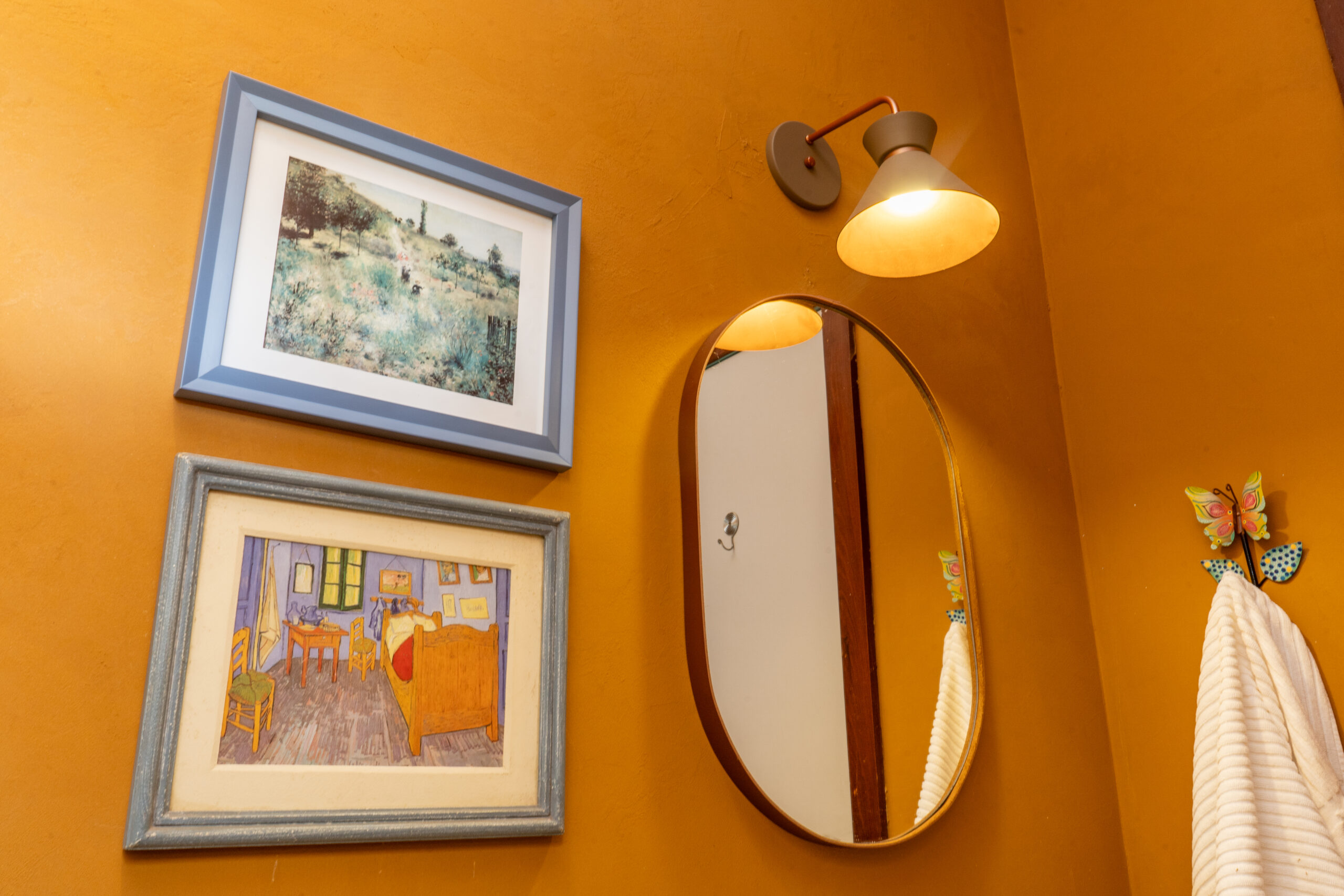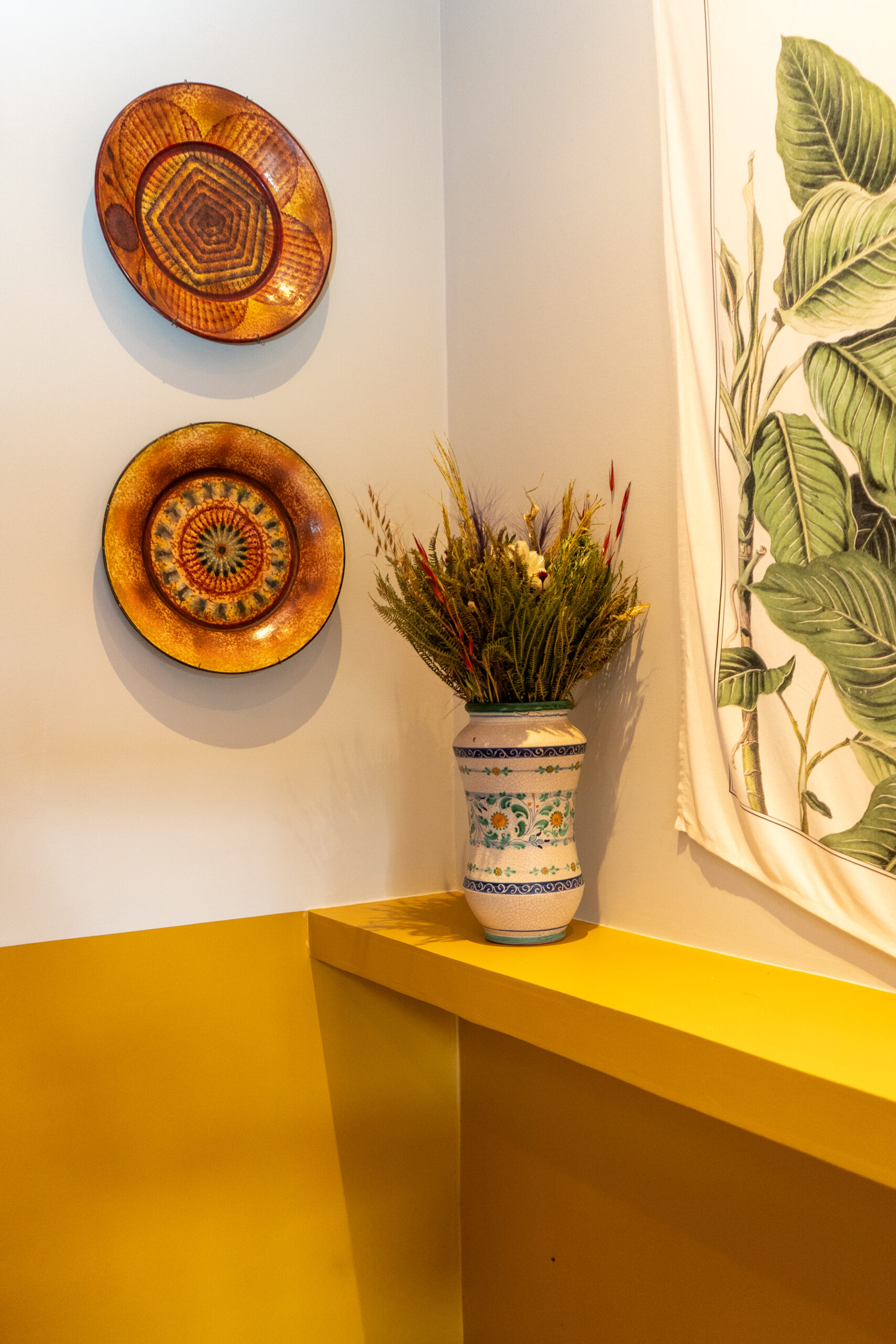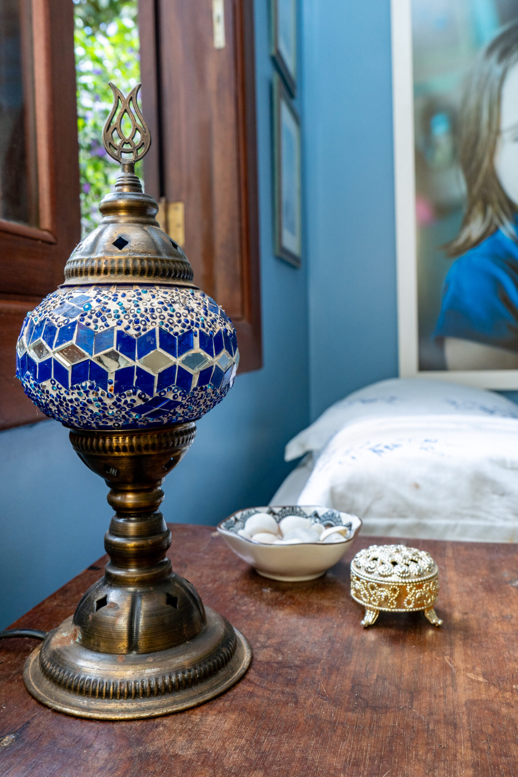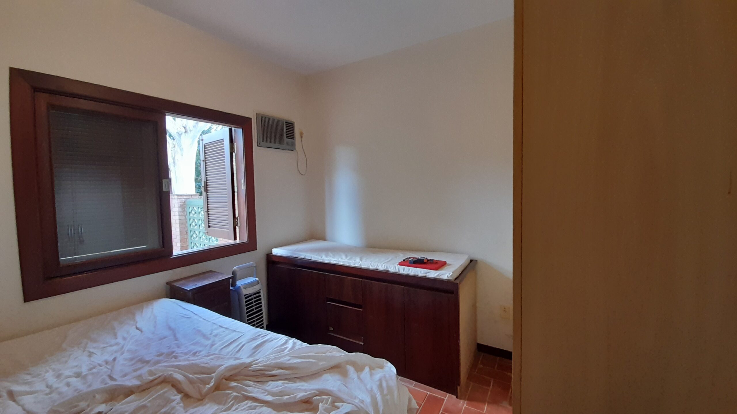 O pedido veio de querer transformar o atual espaço de trabalho, que já foi a primeira casa ocupada pela família no terreno, em um escritório mais organizado, bonito e acolhedor mas não apenas para ela, como também para sua família canina. Além da sala de estar, essa pequena casa conta com uma cozinha, que não foi alterada e mais dois quartos. Um deles virou a sala de tv e o outro seguiu sendo um quarto de hóspedes. No lugar onde antes era a sala de tv integrada na sala de estar/escritório, ficou o cantinho dos cachorros. Um sofá de alvenaria baixo que eles ocupam enquanto sua tutora trabalha, no novo mobiliário do escritório todo projetada para ela. Um mesa ampla em L com espaço para trabalho no computador e fora dele, e uma grande estante para os diversos livros que estavam sem organização.