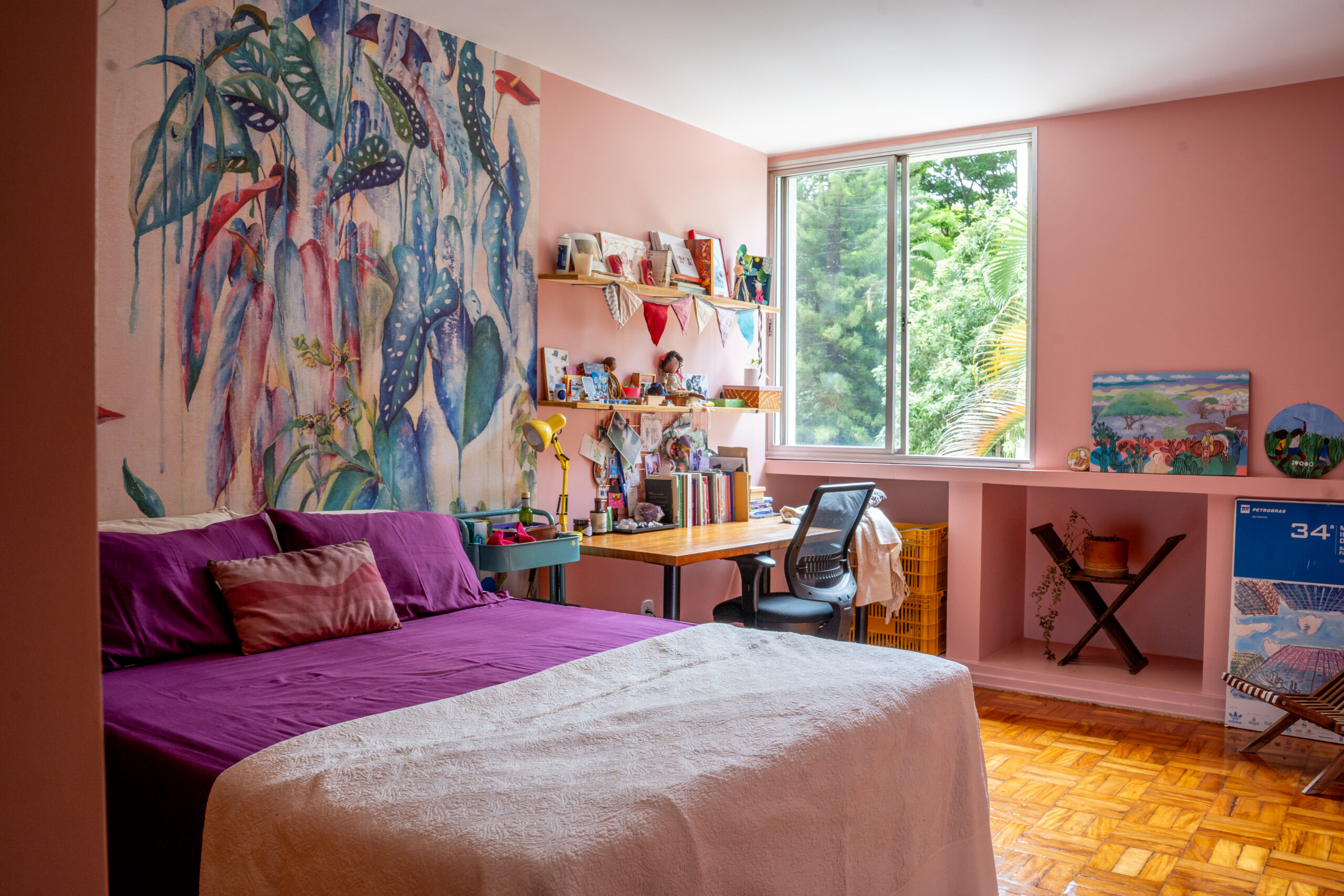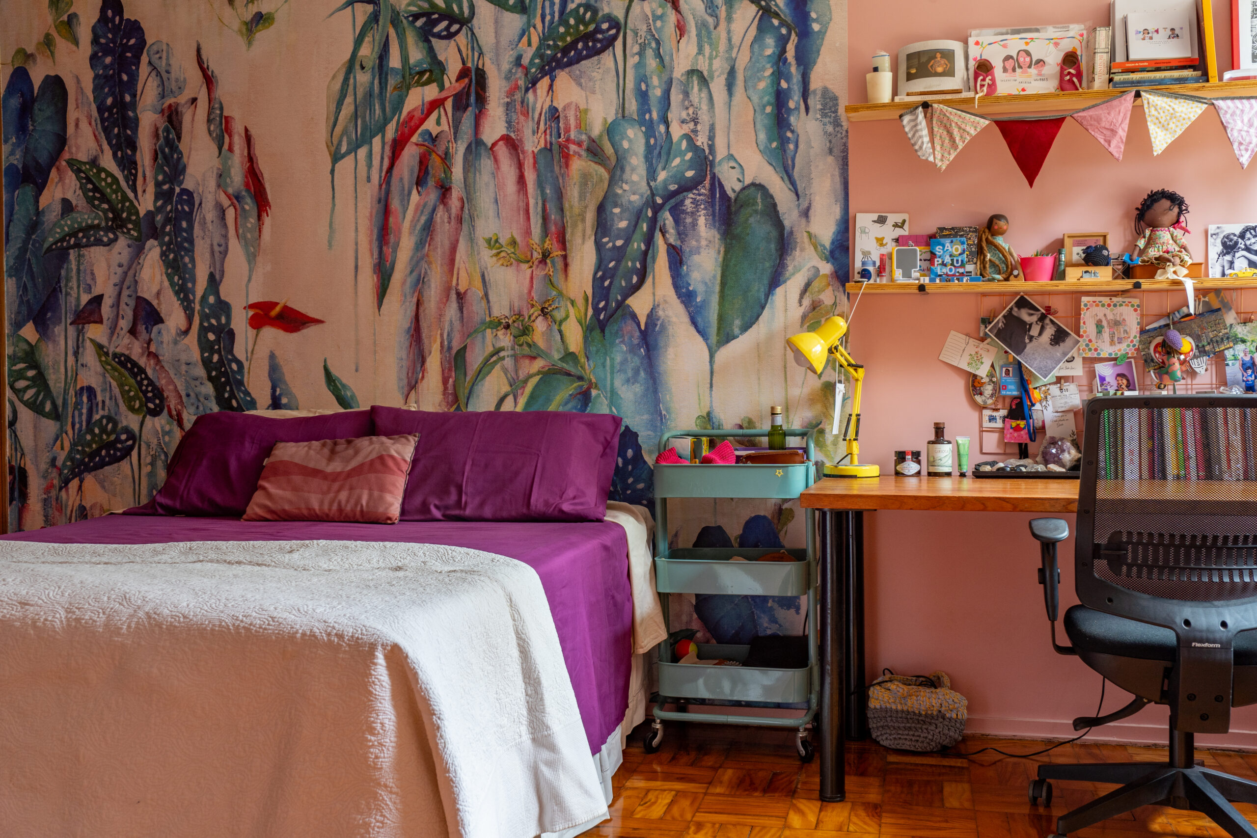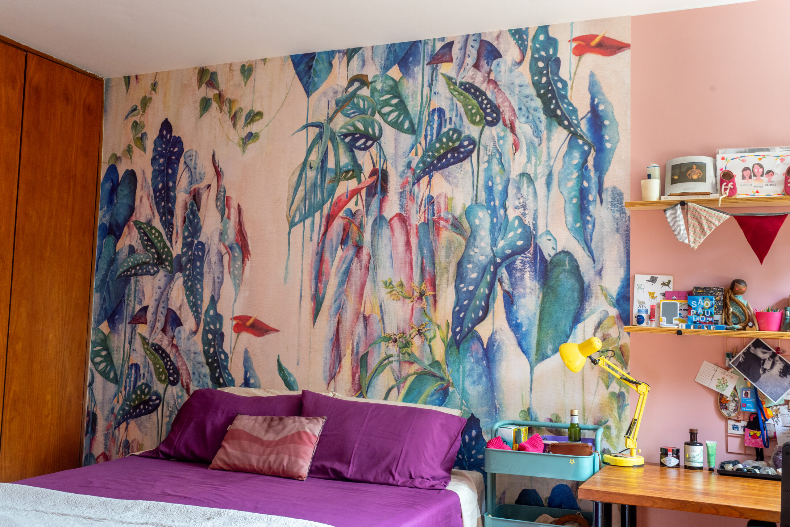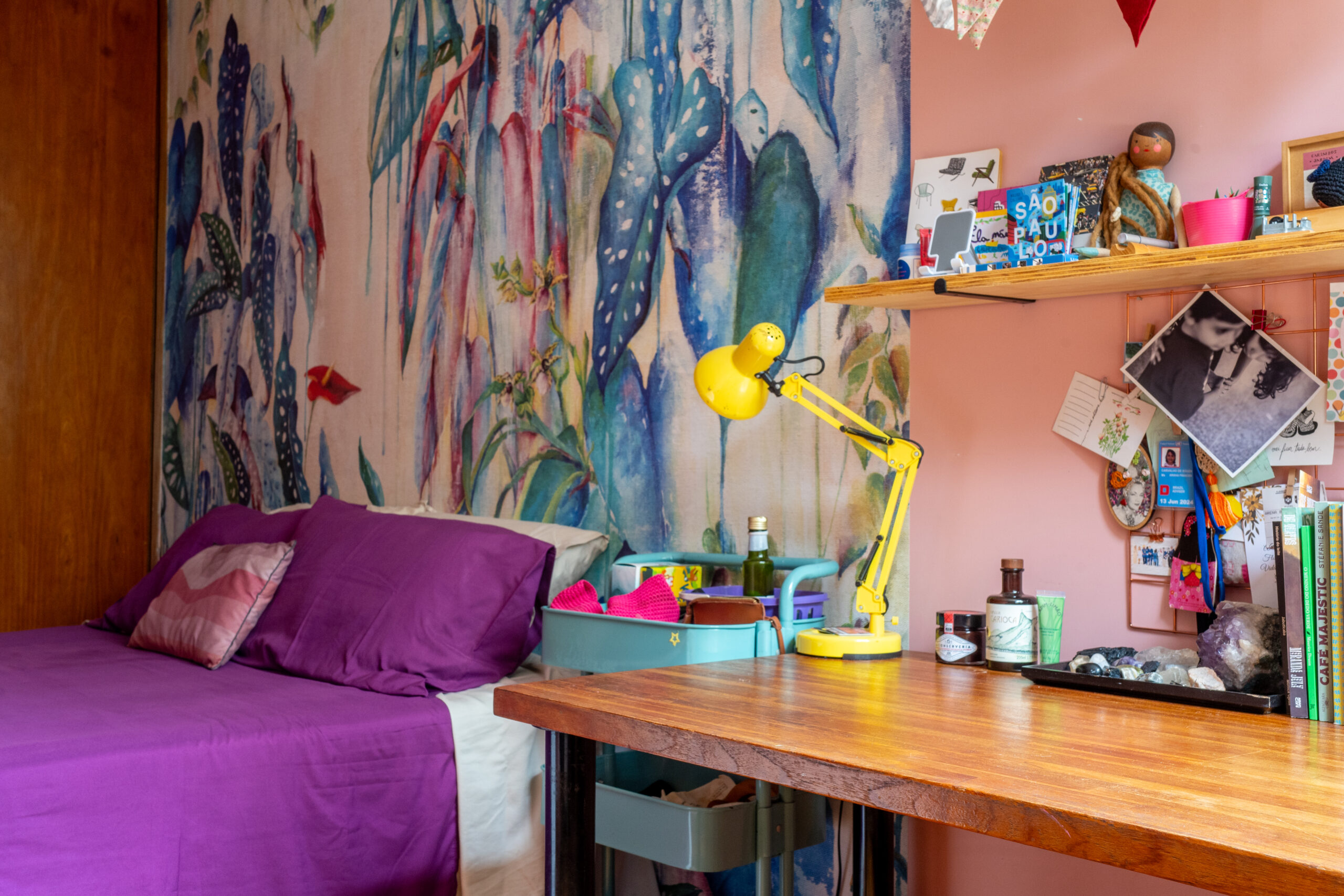 Depois do lavabo onírico, temos o mesmo papel de parede agora aplicado como cabeceira da cama para aí sim estimular os sonhos mais intensos e incríveis. A parte interessante dessa história é que a cliente que colocou esse mesmo papel de parede no lavabo (projeto está aqui no site também) viu ele em uma postagem que havia feito desse quarto mas que por motivos da vida louca teve as fotos tiradas bem depois. Bom, tudo isso para dizer que sim, esse papel de parede é lindo mesmo e cabe em diversos ambientes. Para compor com ele, um rosa claro e a escrivaninha ao lado da cama foi toda aproveitando o mobiliário já existente.