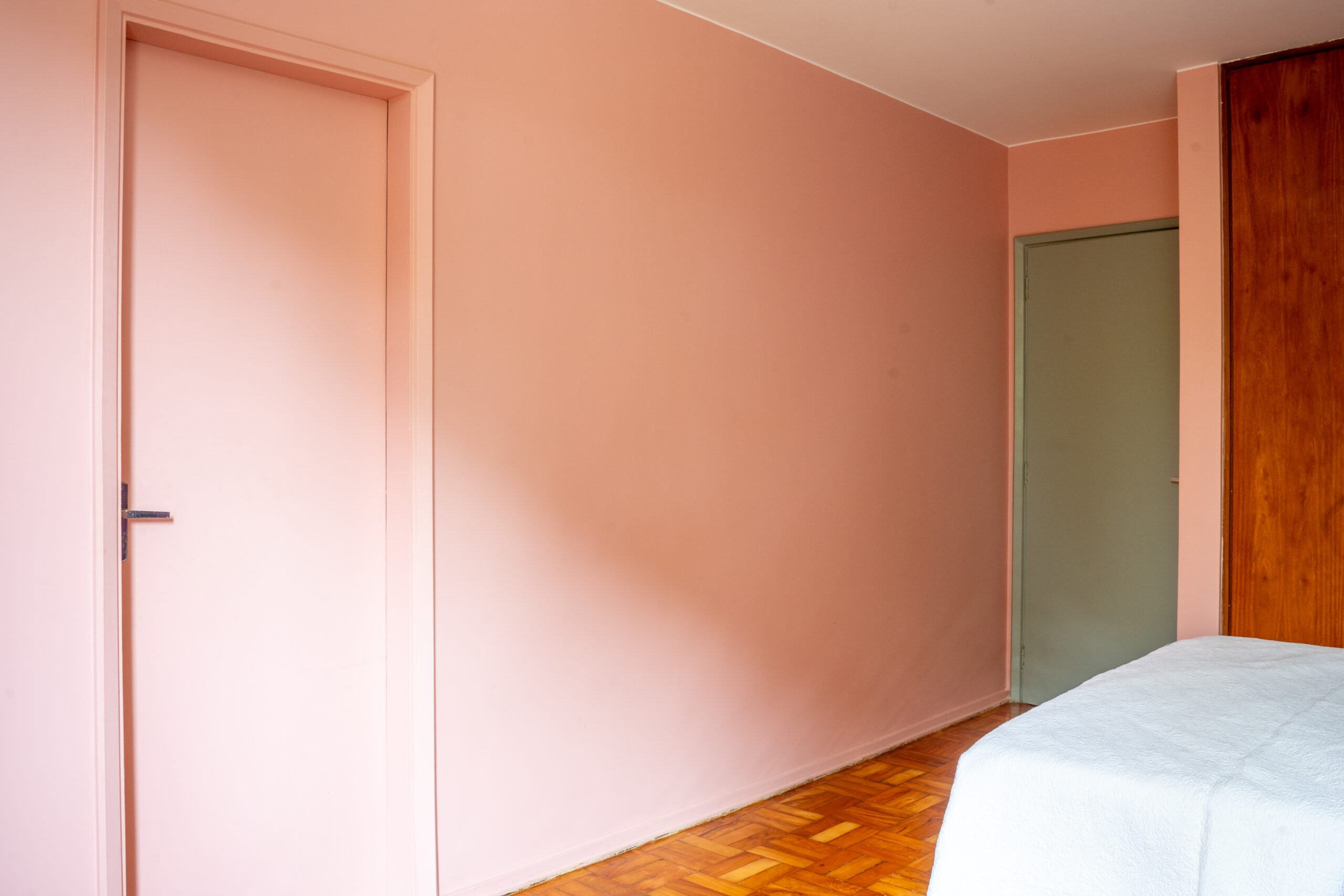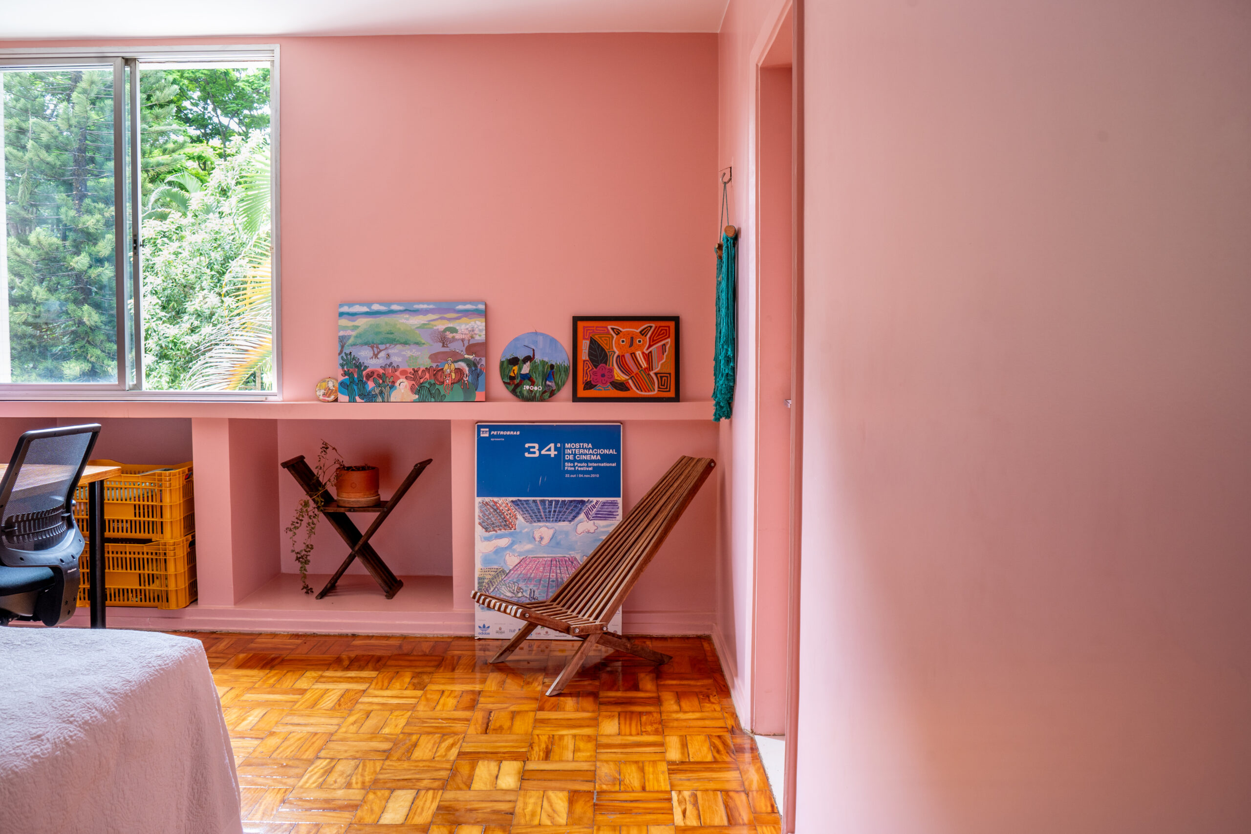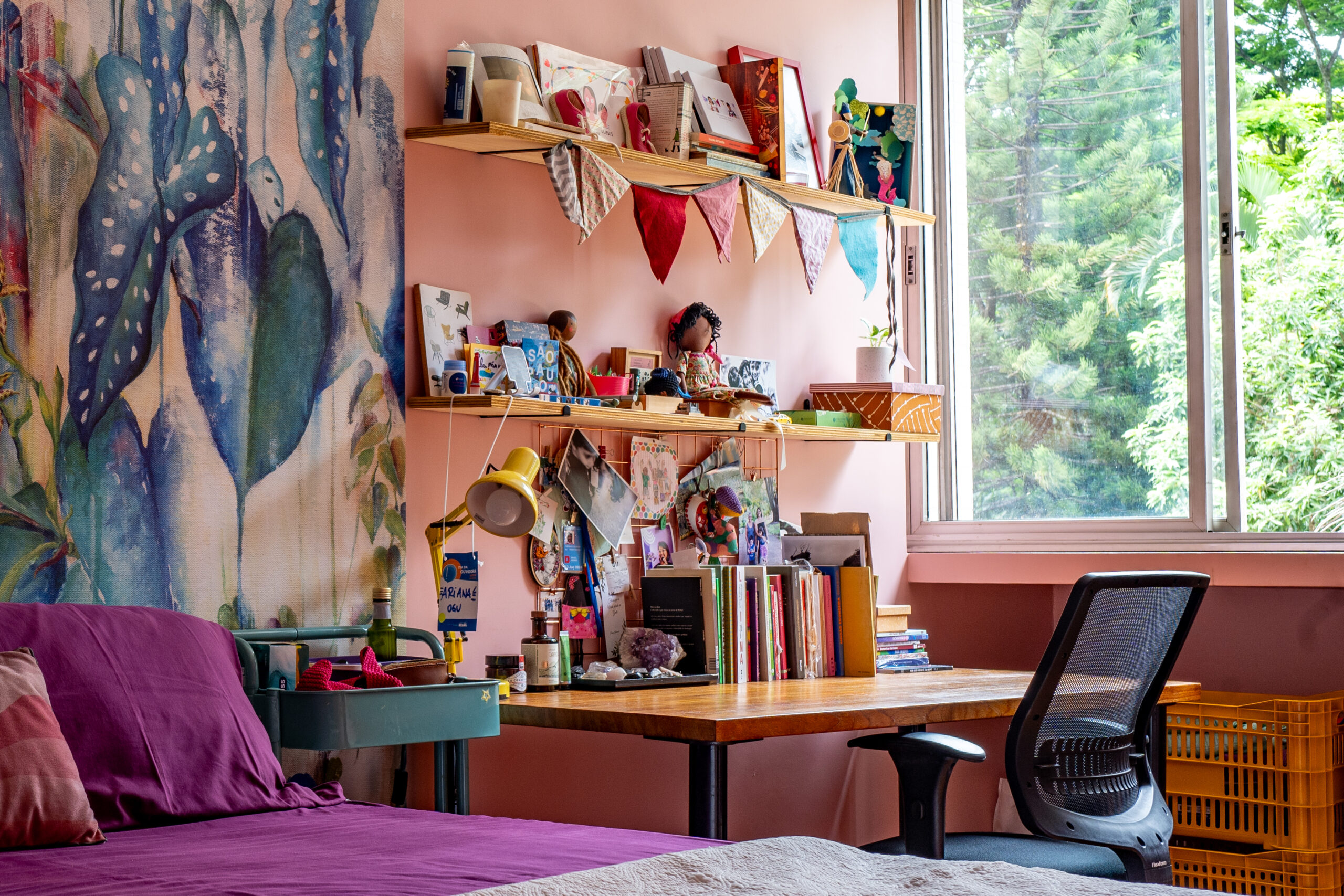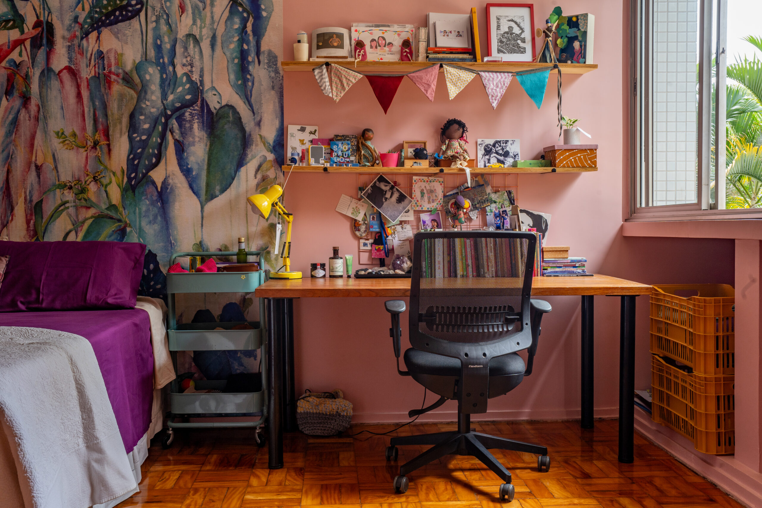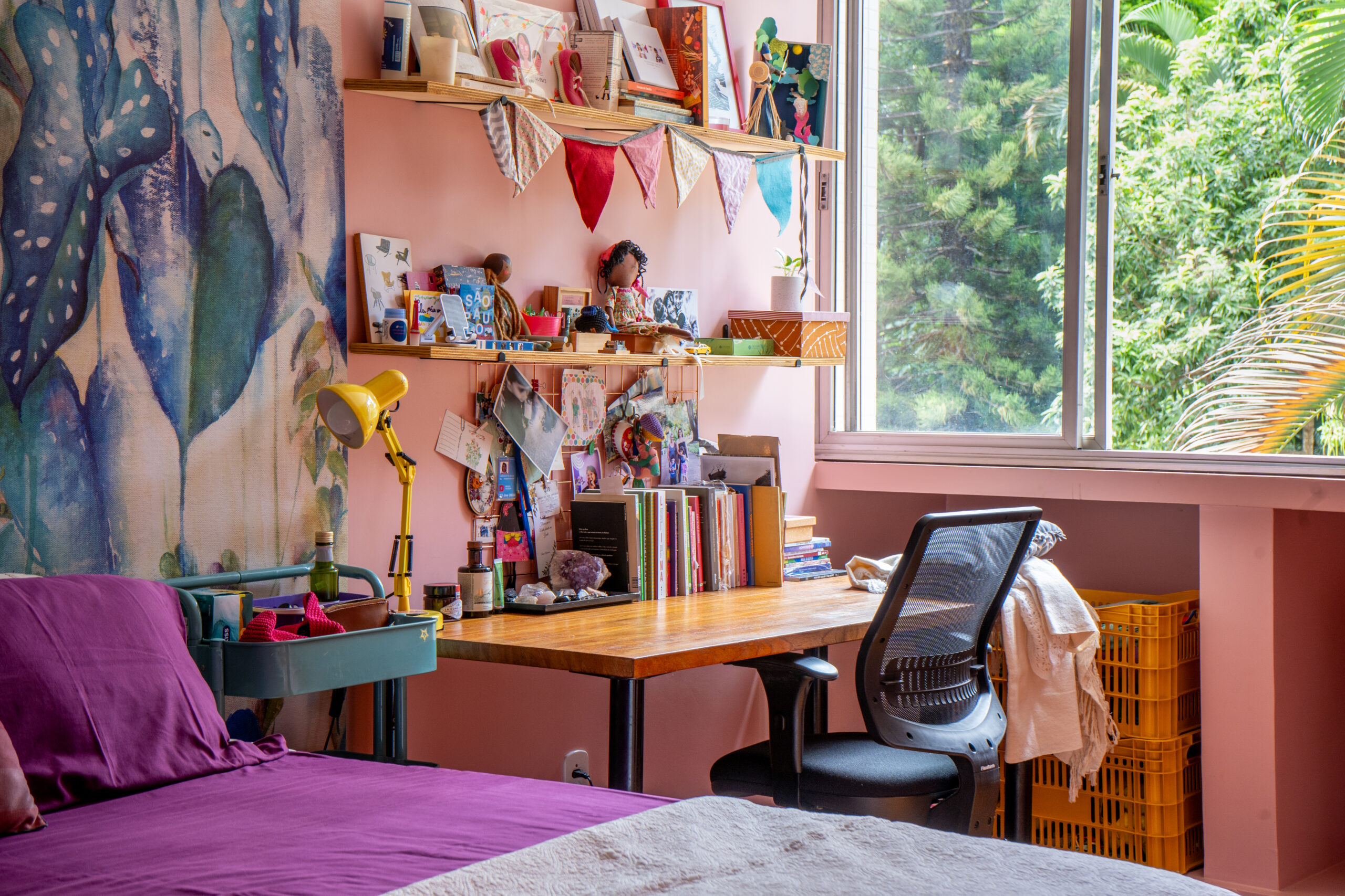 Depois do lavabo onírico, temos o mesmo papel de parede agora aplicado como cabeceira da cama para aí sim estimular os sonhos mais intensos e incríveis. A parte interessante dessa história é que a cliente que colocou esse mesmo papel de parede no lavabo (projeto está aqui no site também) viu ele em uma postagem que havia feito desse quarto mas que por motivos da vida louca teve as fotos tiradas bem depois. Bom, tudo isso para dizer que sim, esse papel de parede é lindo mesmo e cabe em diversos ambientes. Para compor com ele, um rosa claro e a escrivaninha ao lado da cama foi toda aproveitando o mobiliário já existente.