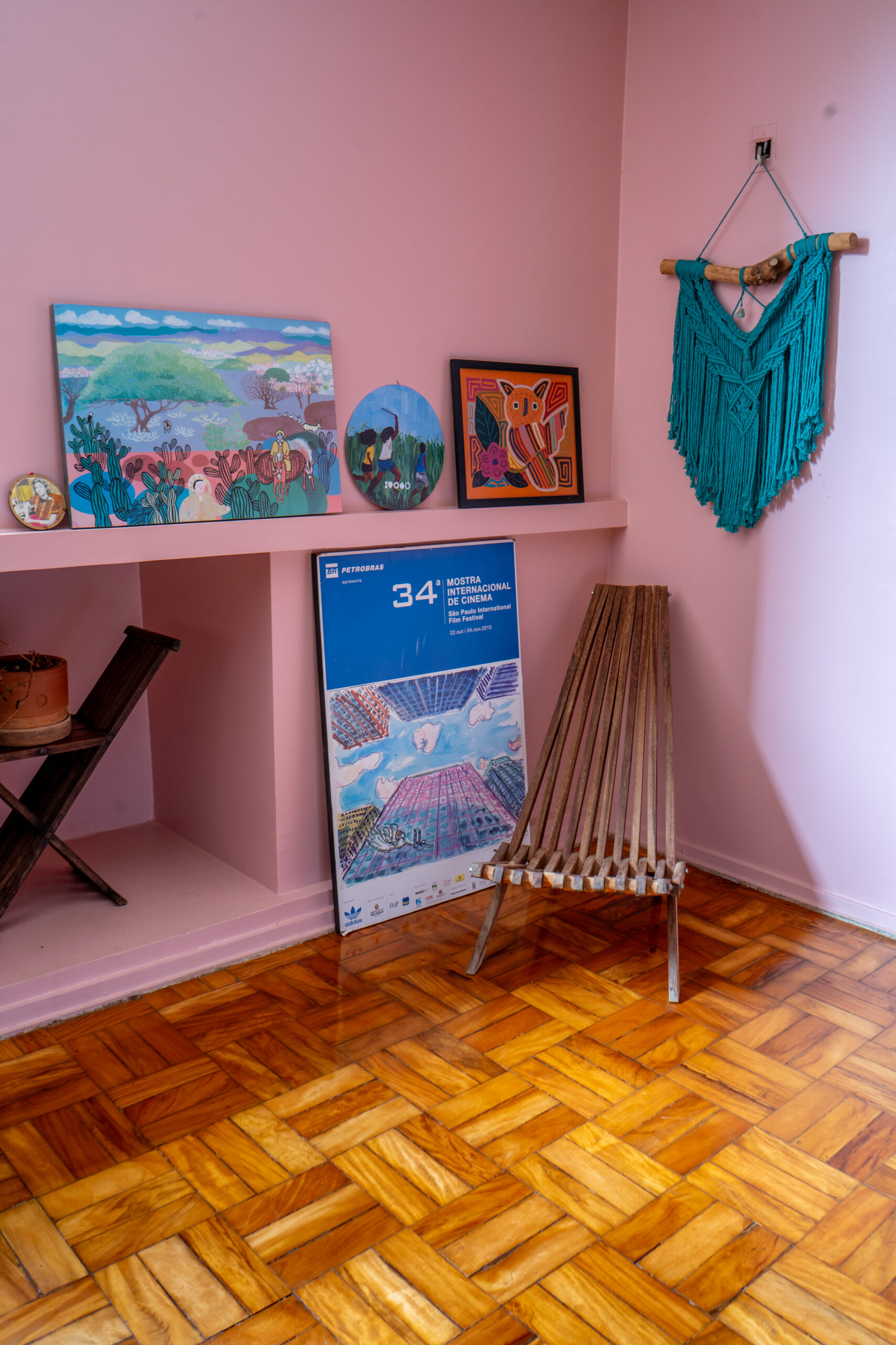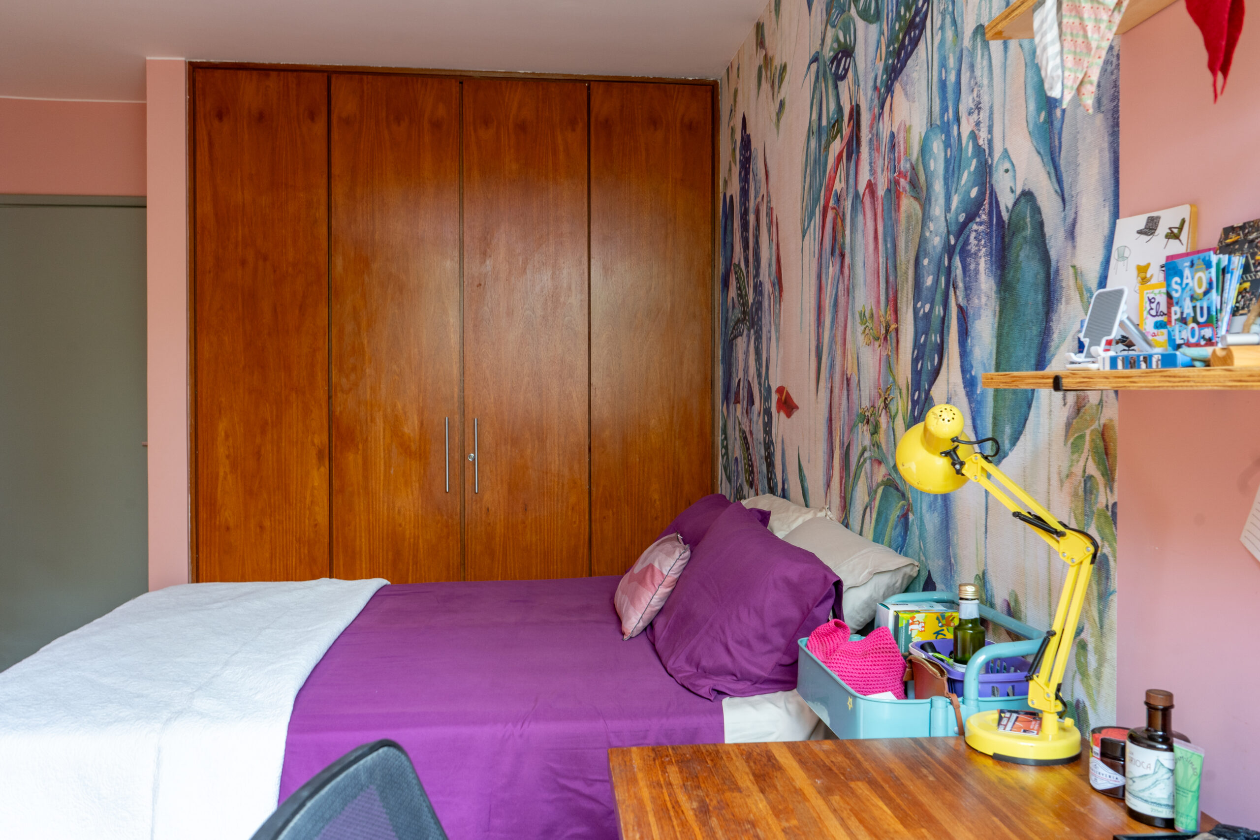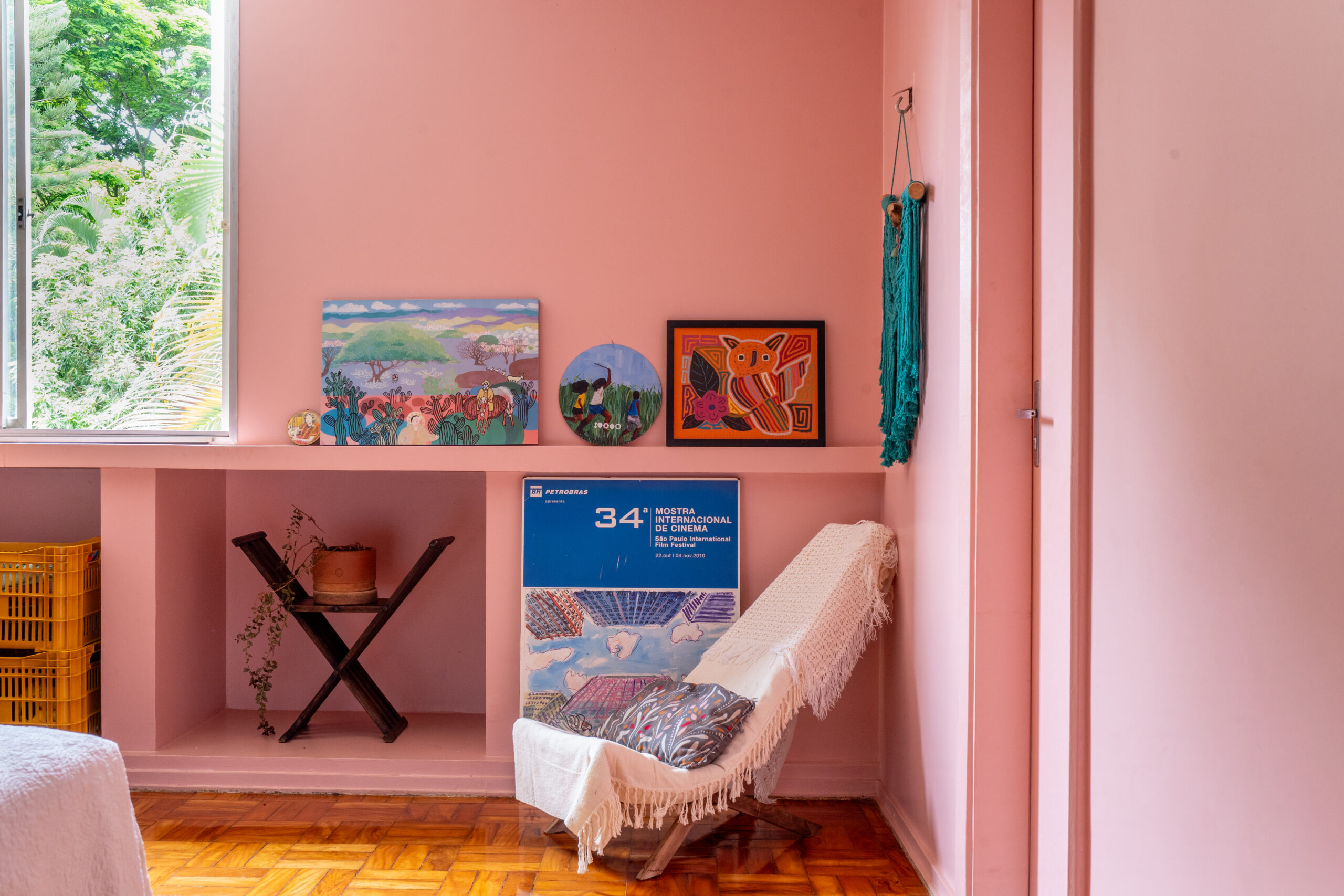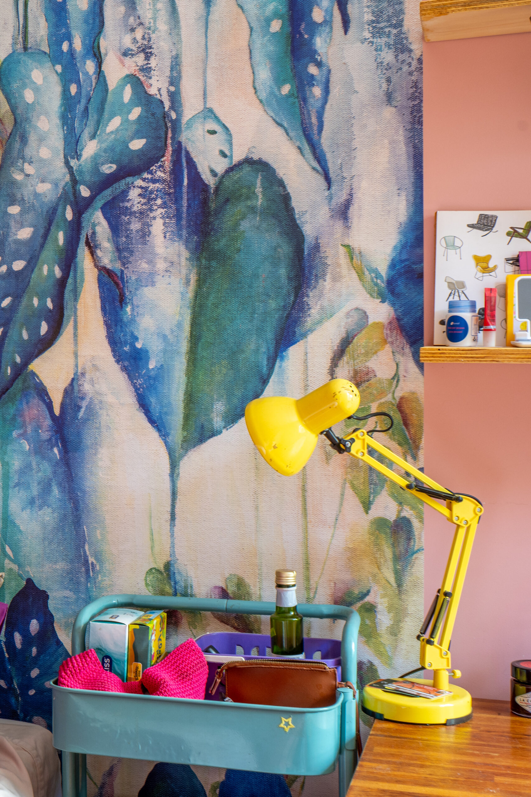 Depois do lavabo onírico, temos o mesmo papel de parede agora aplicado como cabeceira da cama para aí sim estimular os sonhos mais intensos e incríveis. A parte interessante dessa história é que a cliente que colocou esse mesmo papel de parede no lavabo (projeto está aqui no site também) viu ele em uma postagem que havia feito desse quarto mas que por motivos da vida louca teve as fotos tiradas bem depois. Bom, tudo isso para dizer que sim, esse papel de parede é lindo mesmo e cabe em diversos ambientes. Para compor com ele, um rosa claro e a escrivaninha ao lado da cama foi toda aproveitando o mobiliário já existente.